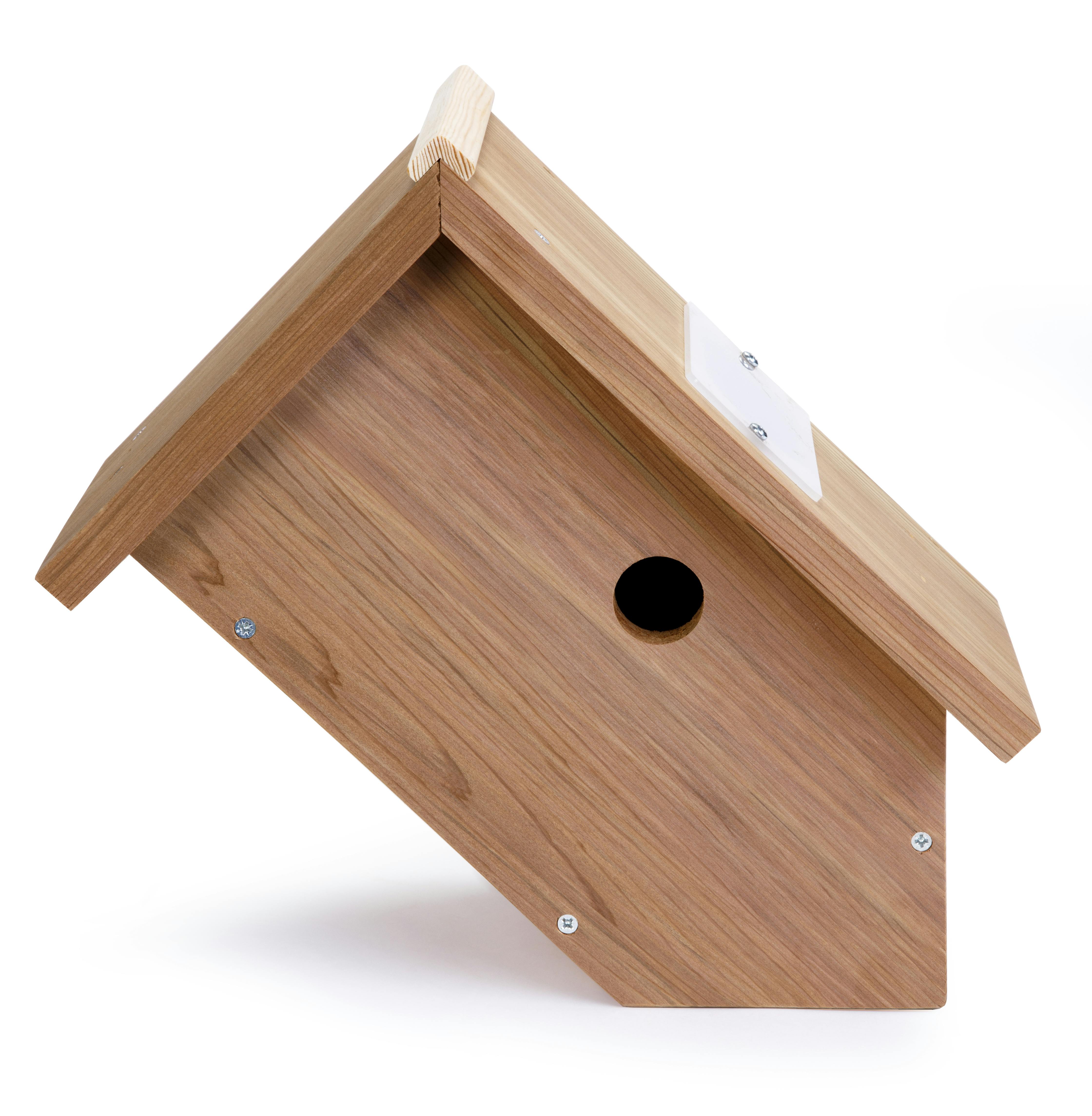 Dit handgemaakte, PEFC-gecertificeerde cederhouten vogelhuis beschikt namelijk over een ingebouwde Sony EFFIO CCD 700TVL hogeresolutiecamera. De 3,6mm-lens heeft een kijkhoek van 92 graden en is vooraf ingesteld op de beste afstand. Als een ware Big Brother is het prille geluk van het kersverse vogelpaar te volgen op de smartphone of tablet. Dankzij de gevoelige microfoon is ook het gekwetter van het jonge kroost goed hoorbaar.
