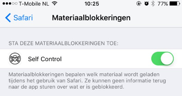 Het enige nadeel van Control Procrastination, zeggen we direct aan het begin, is dat de app niet gratis is. Twee euro betaal je er maar liefst voor. Dat is best veel voor een app die websites blokkeert, maar aan de andere kant, als het ervoor zorgt dat je efficiënter werkt en je minder af laat leiden, heb je die twee euro natuurlijk zo terugverdiend. Wanneer je Control Procrastination hebt geïnstalleerd, ga je naar Instellingen / Safari / Materiaalblokkeringen. Daar schakel je Control Procrastination in.