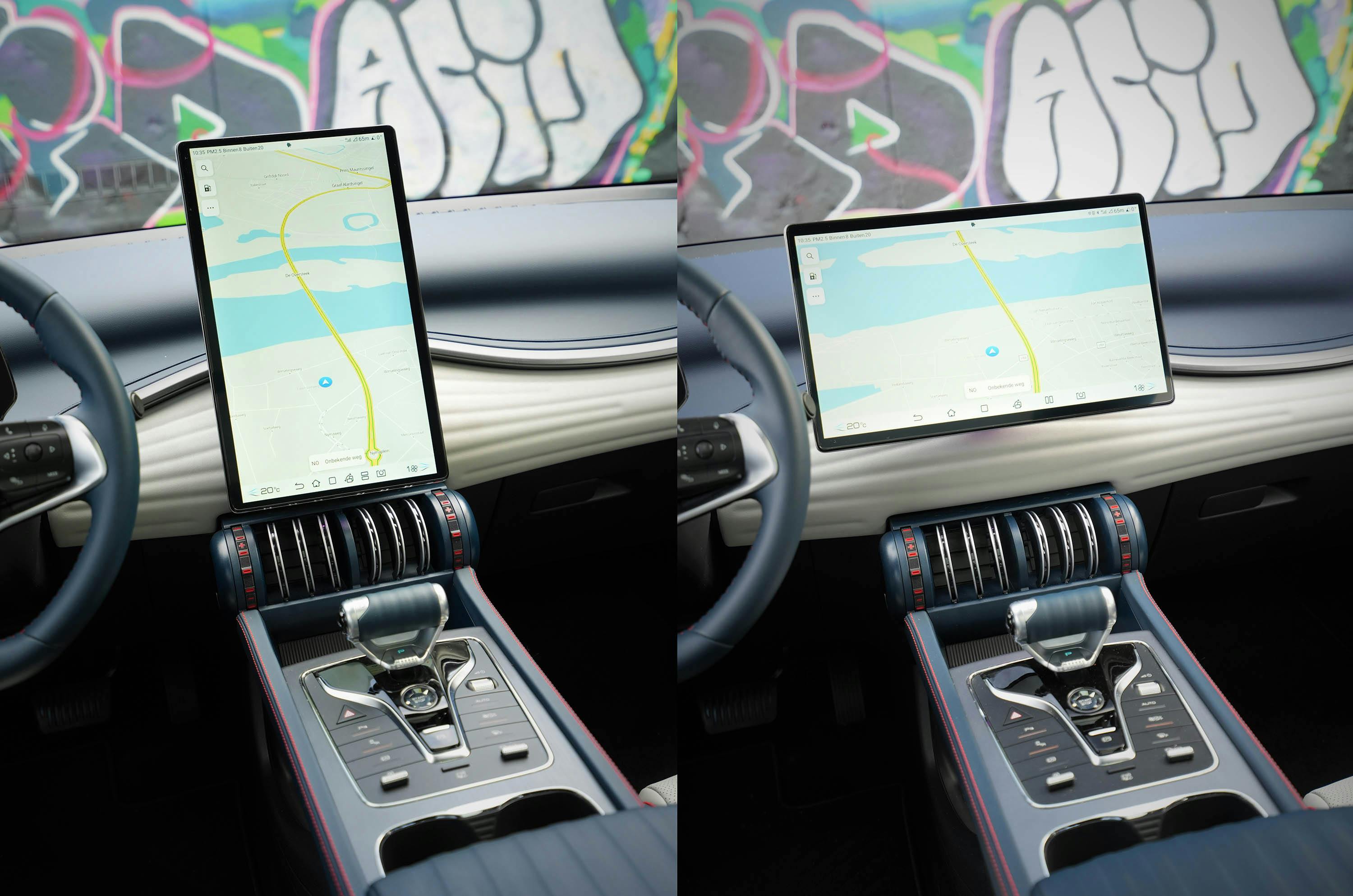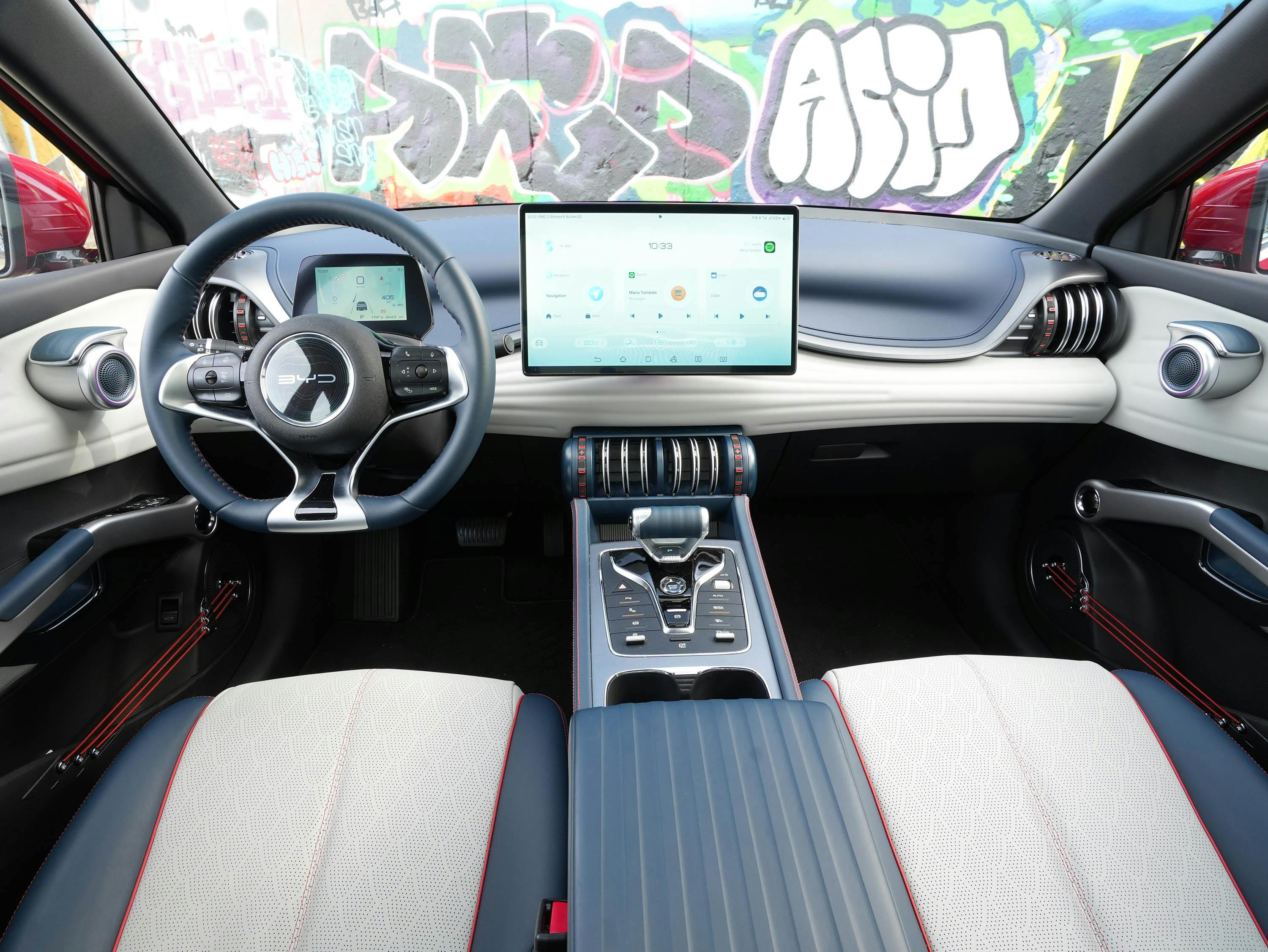 Het interieur van de Atto 3 is fantasierijk van design. Organische vormen hebben de overhand en je ziet tal van geinige details. Daar moet je van houden; lang niet iedereen doet dat en zelfs de associatie met een walvis werd gemaakt. Ongeacht de uitvoering is het interieur bekleed met donkerblauw, lichtgrijs en zwart kunstleer, dat is afgebiesd met rode draad. Een gimmick is het kantelbare touchscreen midden op het dashboard; handig om bij het kaartlezen het scherm rechtop te zetten, maar verder ontgaat ons het nut ervan. Alle functies worden bediend via dit grote scherm: van airco tot navigatie en van rijprogramma's (Eco, Normal of Sport) tot audio. Voordat wij onze weg een beetje in het systeem hadden gevonden, waren we een paar dagen verder.