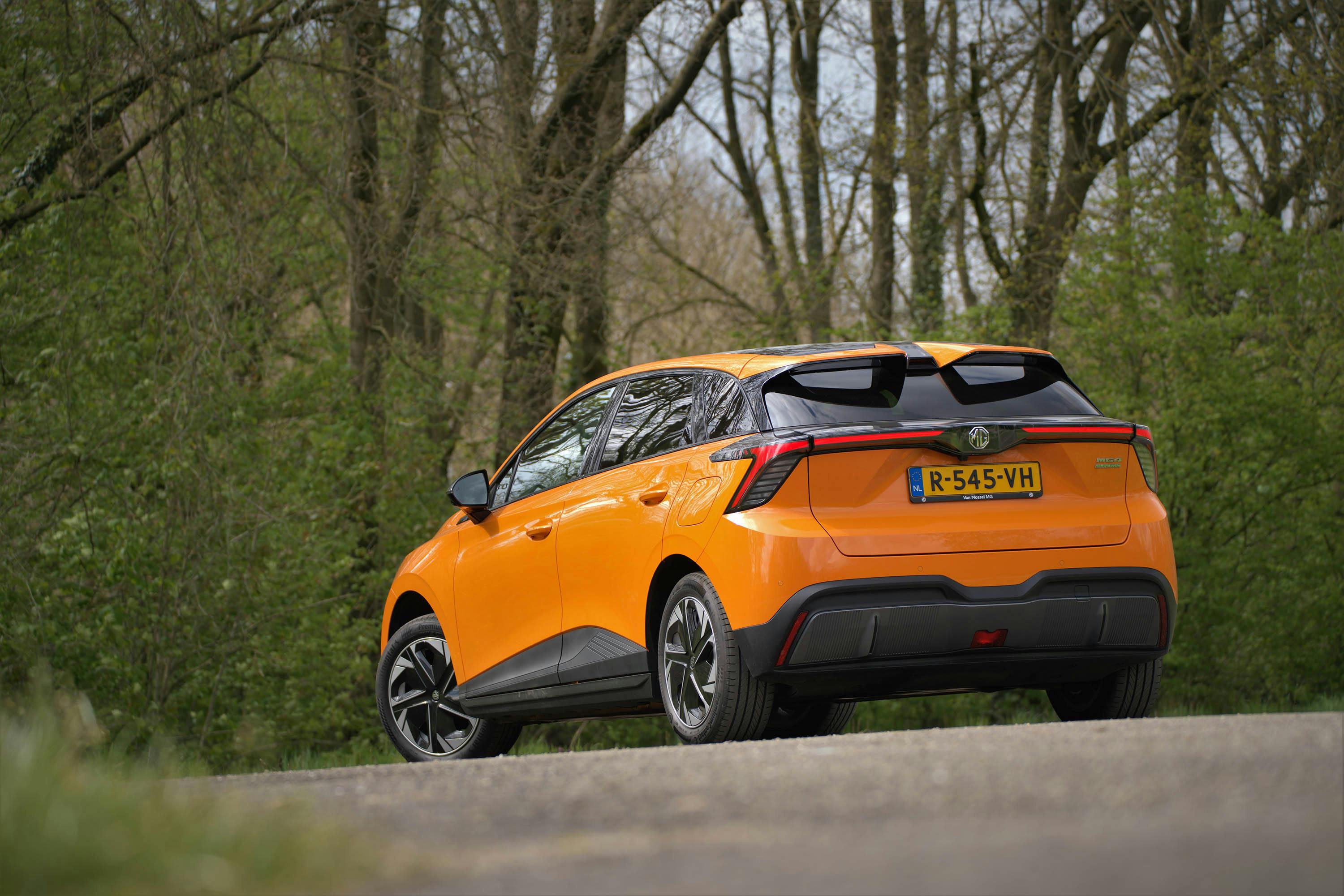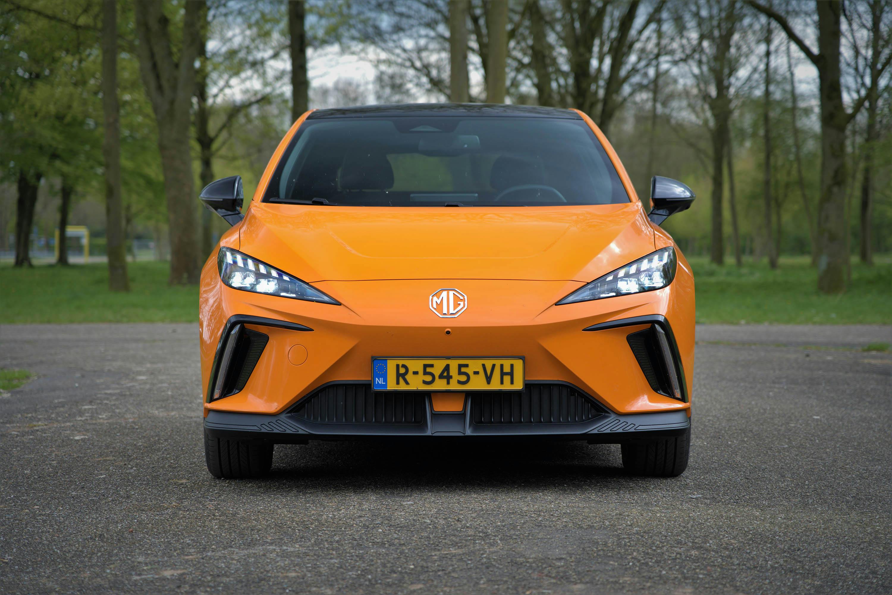 Maar laten we ons hier concentreren op de MG 4 Electric. Voorlopig is dit het goedkoopste model van het Chinese merk. Het design van de vijfdeurs hatchback is beslist opvallend, waarbij de oranje lakkleur van onze testauto natuurlijk ook een handje helpt. Scherpe vormen, strakke lijnen en sportieve details als de dubbele dakspoiler voeren de boventoon; alsof de ontwerpers van Lamborghini zich aan deze gezinsauto hebben gewaagd. Een dynamische verschijning!