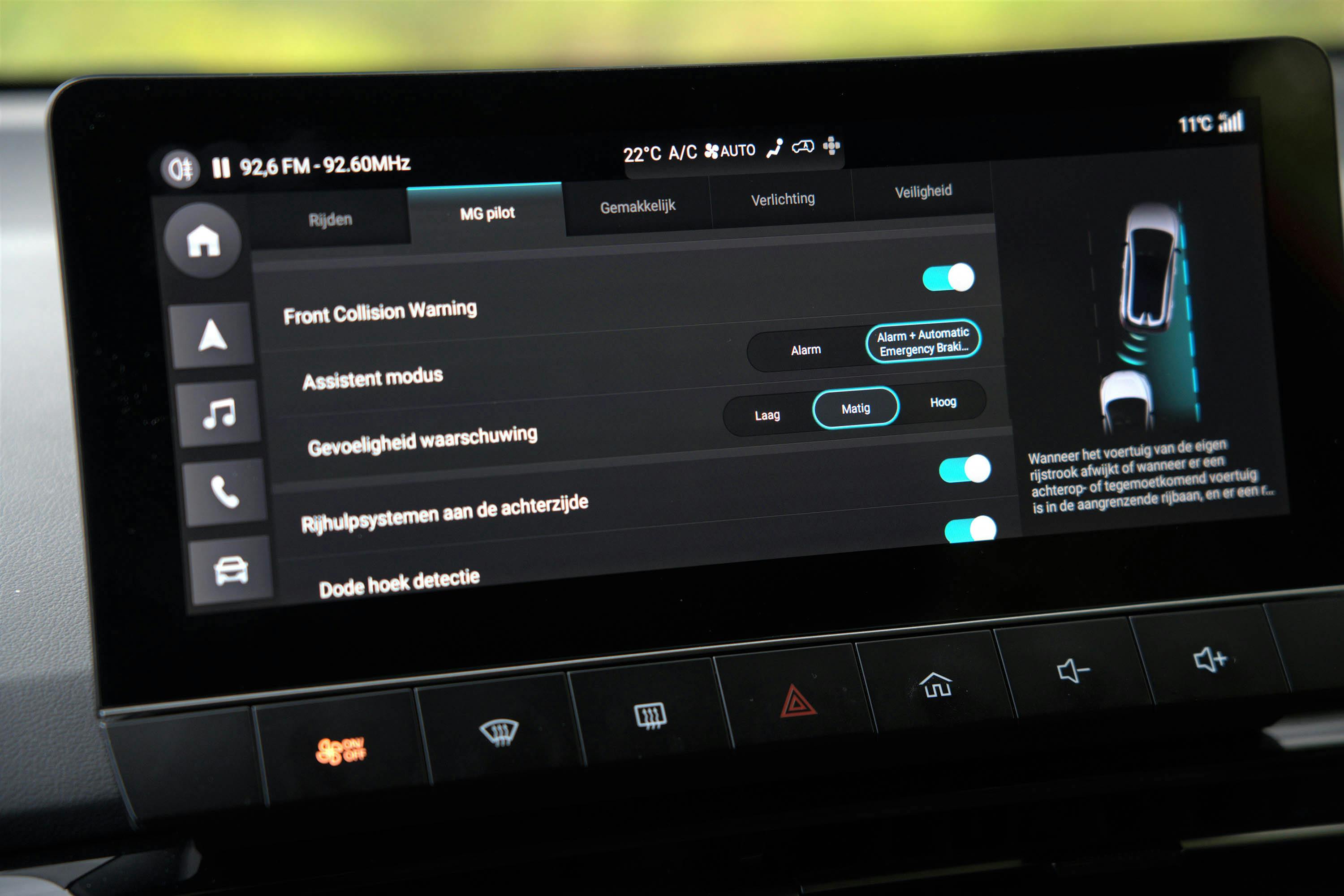 En dat geldt ook voor de veiligheidssystemen die op de MG 4 Electric zitten. Met name de automatische spoorassistent mag wat ons betreft opnieuw worden geprogrammeerd. Zodra je de wegbelijning dreigt te overschrijden, grijpt de elektronica resoluut in. Je schrikt je een ongeluk – bijna letterlijk! Je eerste reactie is een soepele stuurcorrectie, maar de elektronica is daarvan niet gediend. De besturing van de auto lijkt dan wel even te 'bevriezen'. Geen beweging in het stuur te krijgen! Een verschijnsel dat we in andere auto's niet eerder hebben meegemaakt. Ook al duurt het maar een fractie van een seconde, de paniek slaat je om het hart – levensgevaarlijk! Dus zit er maar een ding op: bij elke rit meteen die automatische spoorassistent uitschakelen. Moet toch niet helemaal de bedoeling zijn, dunkt ons...