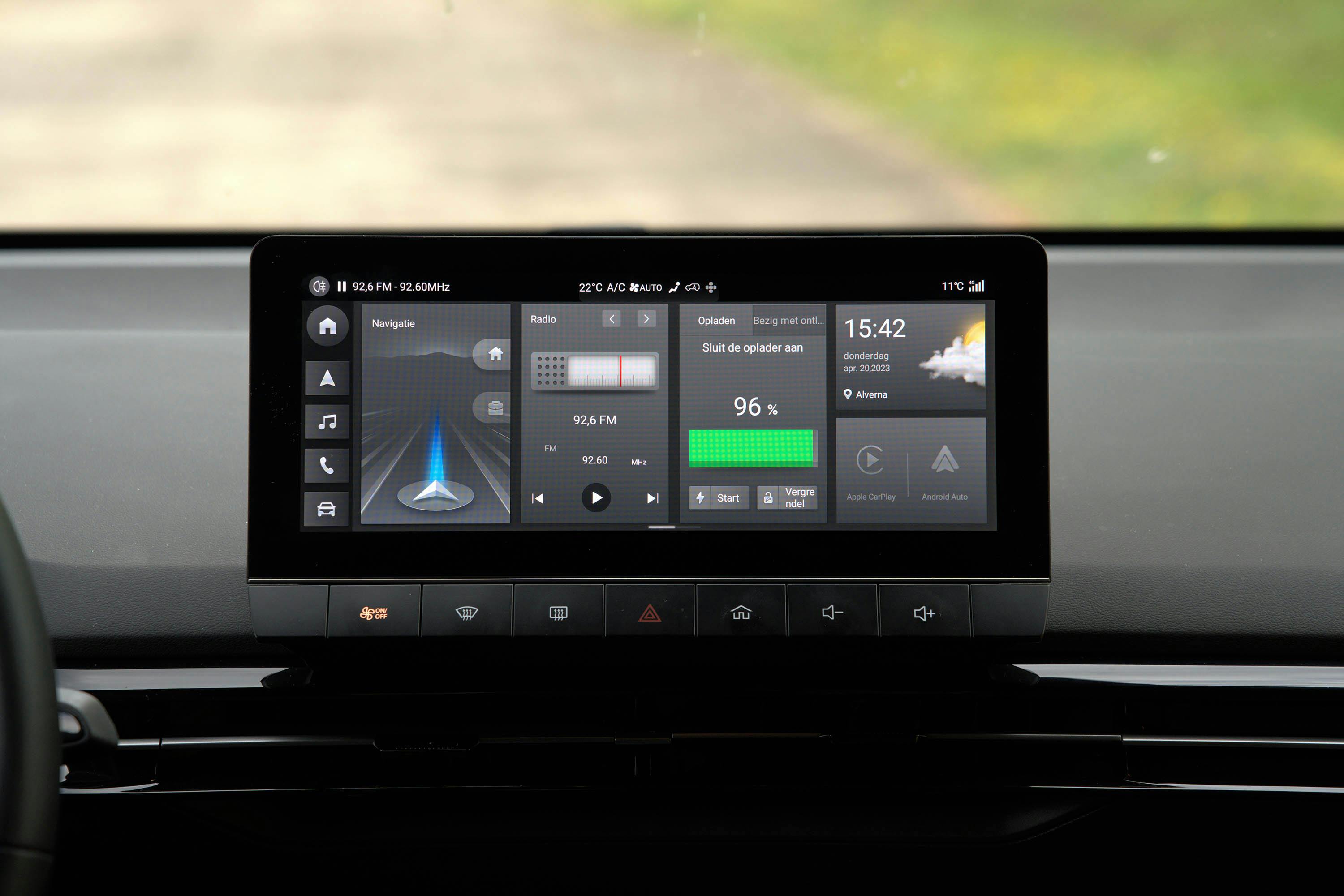Het interieur van de MG 4 Electric is volgens het bekende EV-recept: achter het stuur wordt de belangrijkste informatie voor onderweg via een klein digitaal scherm vertoond. En in het midden van het dashboard is een liggend 10,25-inch beeldscherm geplaatst, waarmee de belangrijkste functies zoals de navigatie, verwarming en audio worden bediend. Eronder zit een rijtje knoppen waarmee basale functies zoals het audiovolume en de voor- en achterruitverwarming bediend worden. Handig: de home-knop, waarmee je in één keer terug naar de beginpagina van het multimediascherm terugkeert.