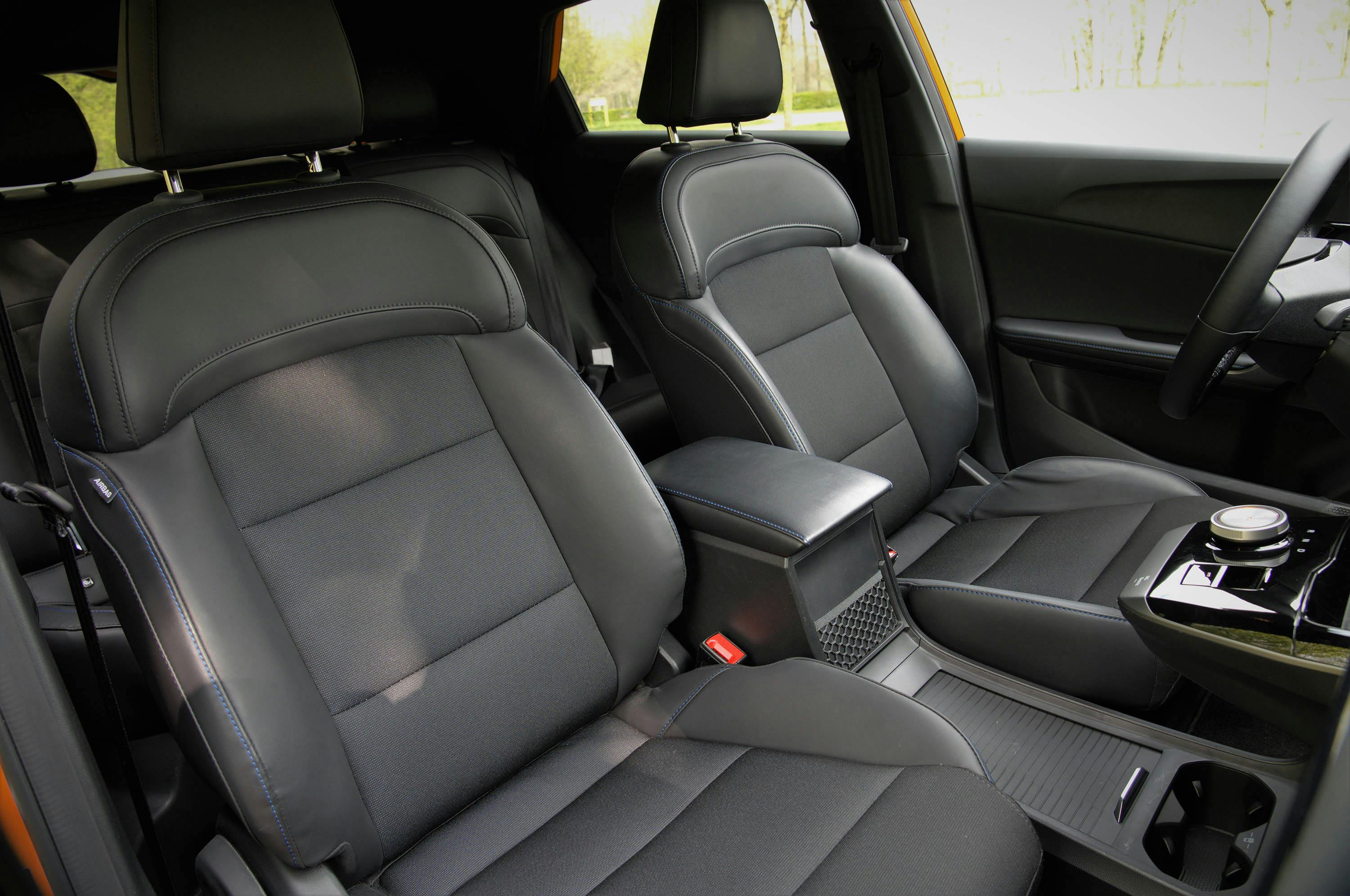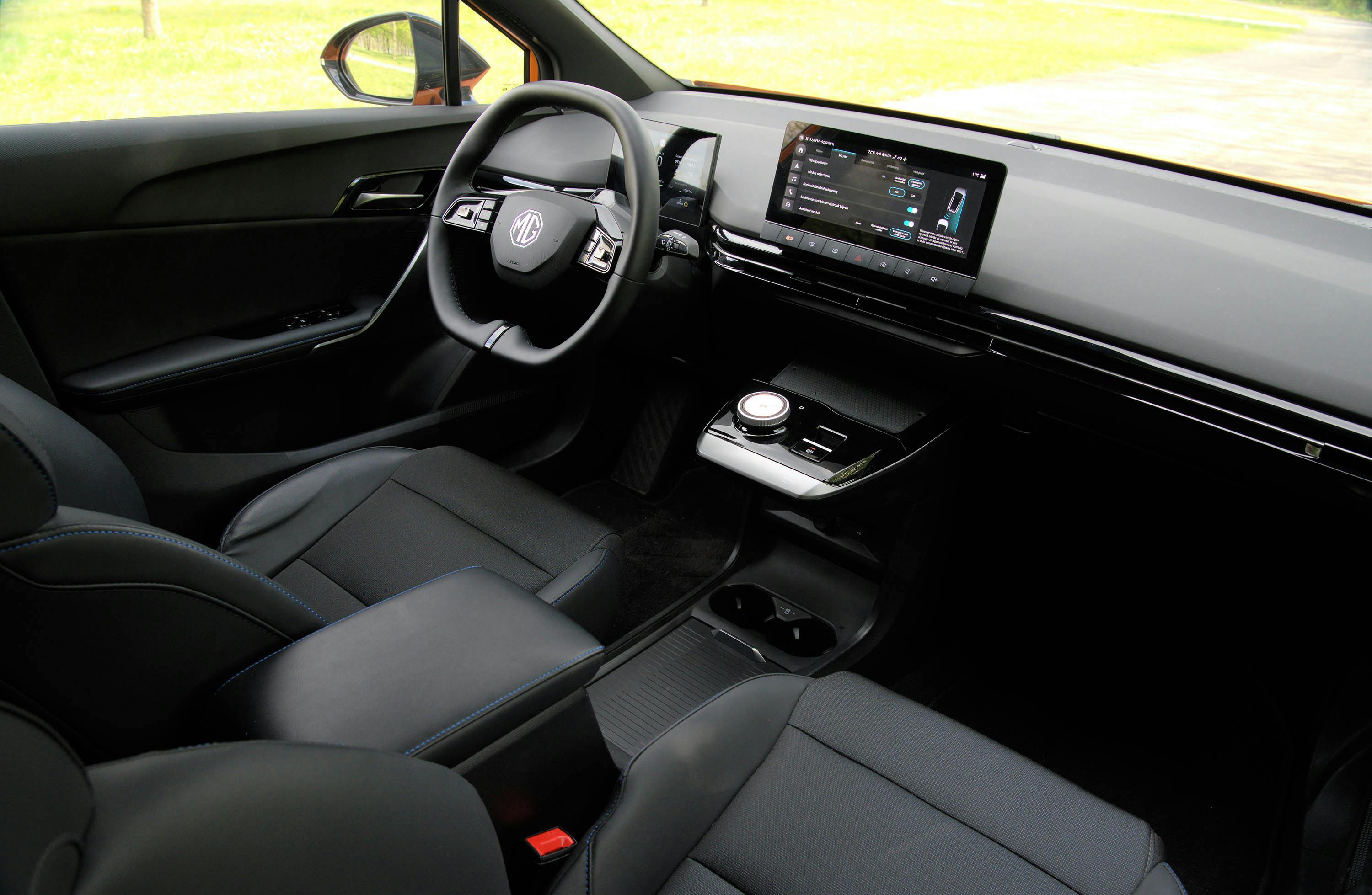Het design van het interieur is minder expressief dan dat van de carrosserie. De donkere kunststoffen maken van het geheel een opgeruimde en zakelijke omgeving. De afwerking is in orde, de gebruikte materialen doen wat goedkoop en kwetsbaar aan. Maar dat heeft een reden – lees hieronder waarom! De stoelen van de MG 4 Electric zitten dan weer prima, met een zachte vulling voor hoogstaand zitcomfort. De zitting is weliswaar aan de korte kant, maar de rugleuning biedt je torso op de juiste plaatsen een goede ondersteuning. De stoffering zorgt helaas al snel voor een plakkerige rug.