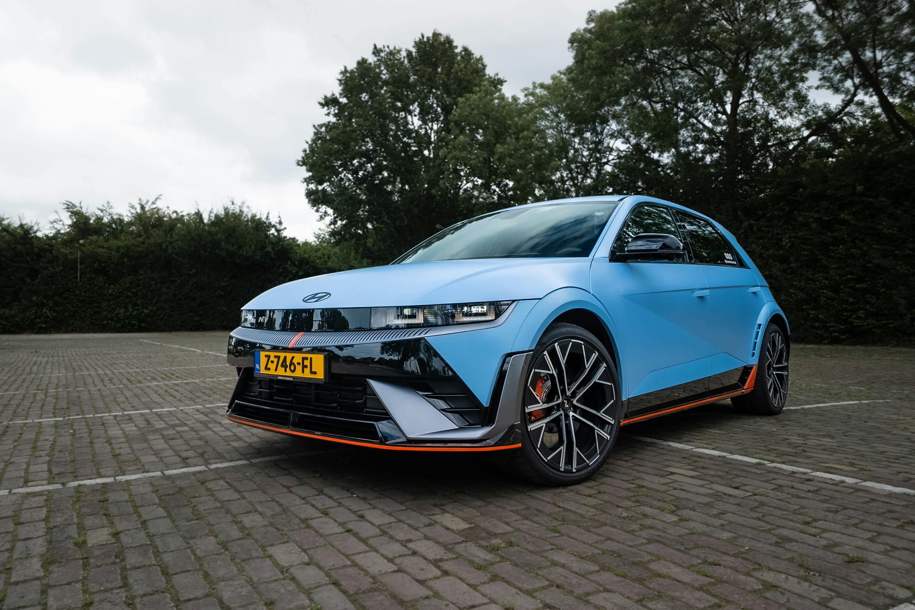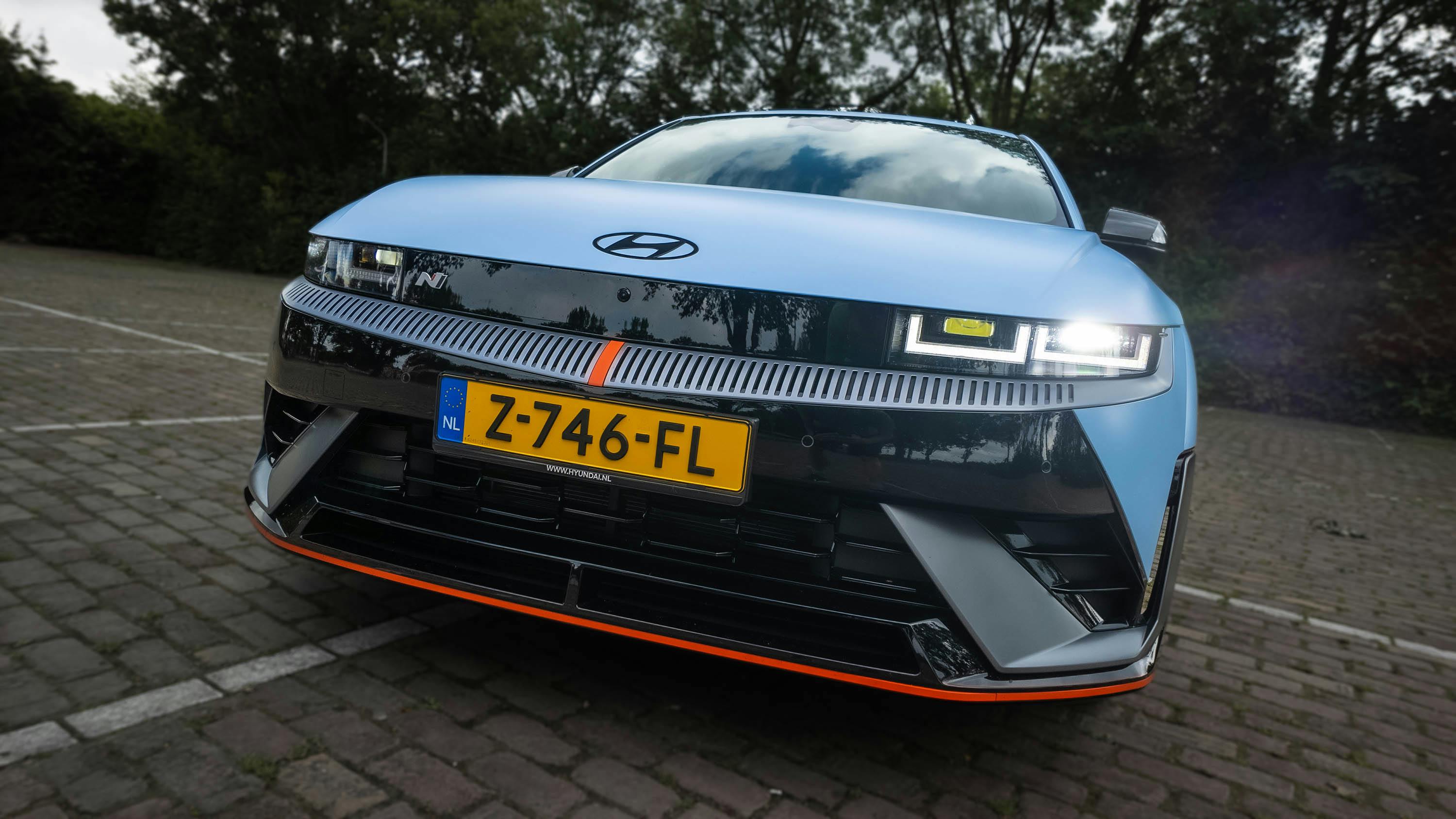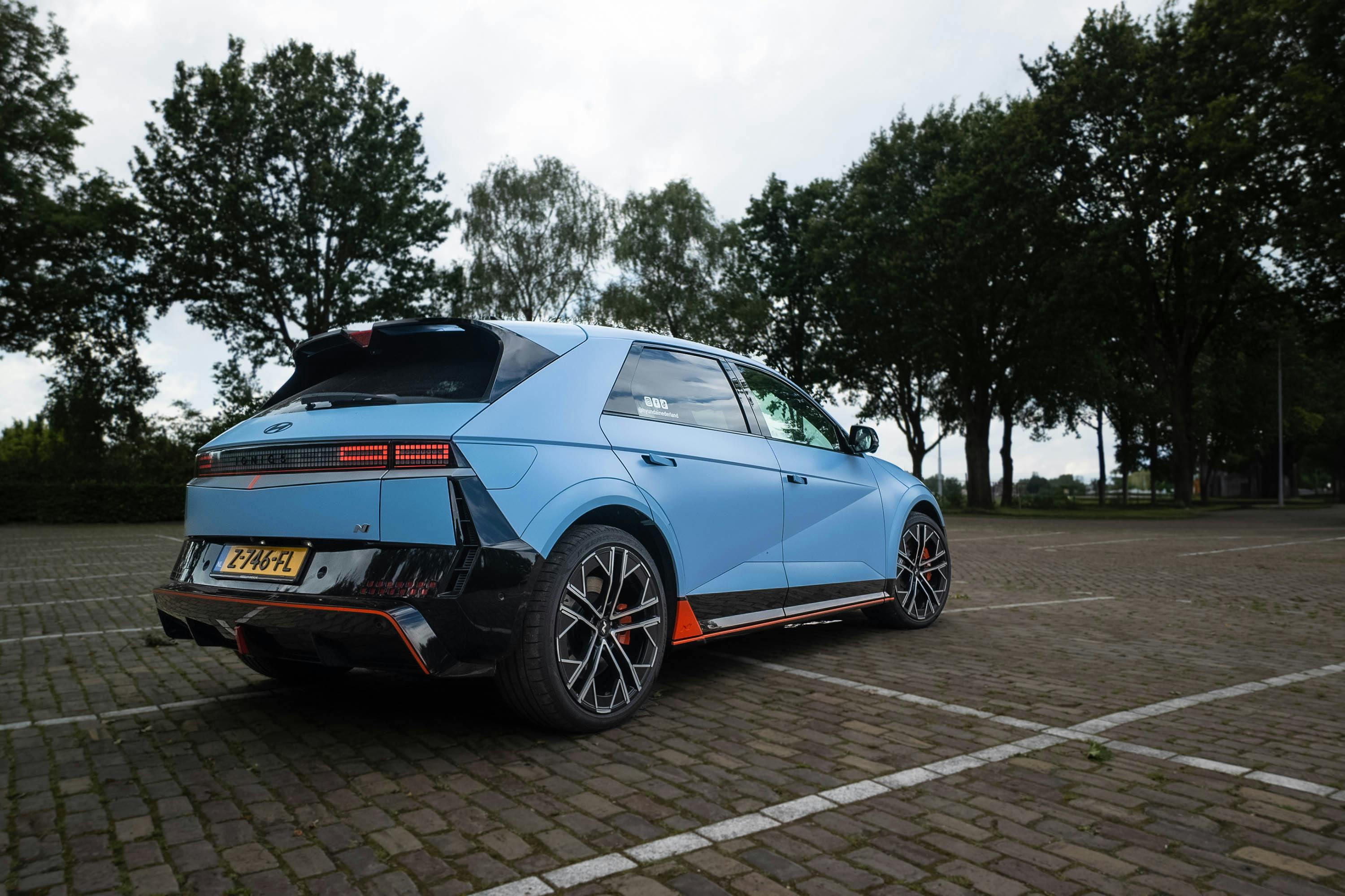 In Nederland stond er een Hyundai IONIQ 5 N in Performance Blue Matte op me te wachten. Deze kleur doet het onconventionele en nog steeds frisse design alle eer aan. Het is een van de vier matte tinten uit het kleurenpalet van tien opties. Verder is alles standaard, van de sportieve voor- en achterbumper tot de 21-inch lichtmetalen velgen met Pirelli P-Zero-rubber rondom.