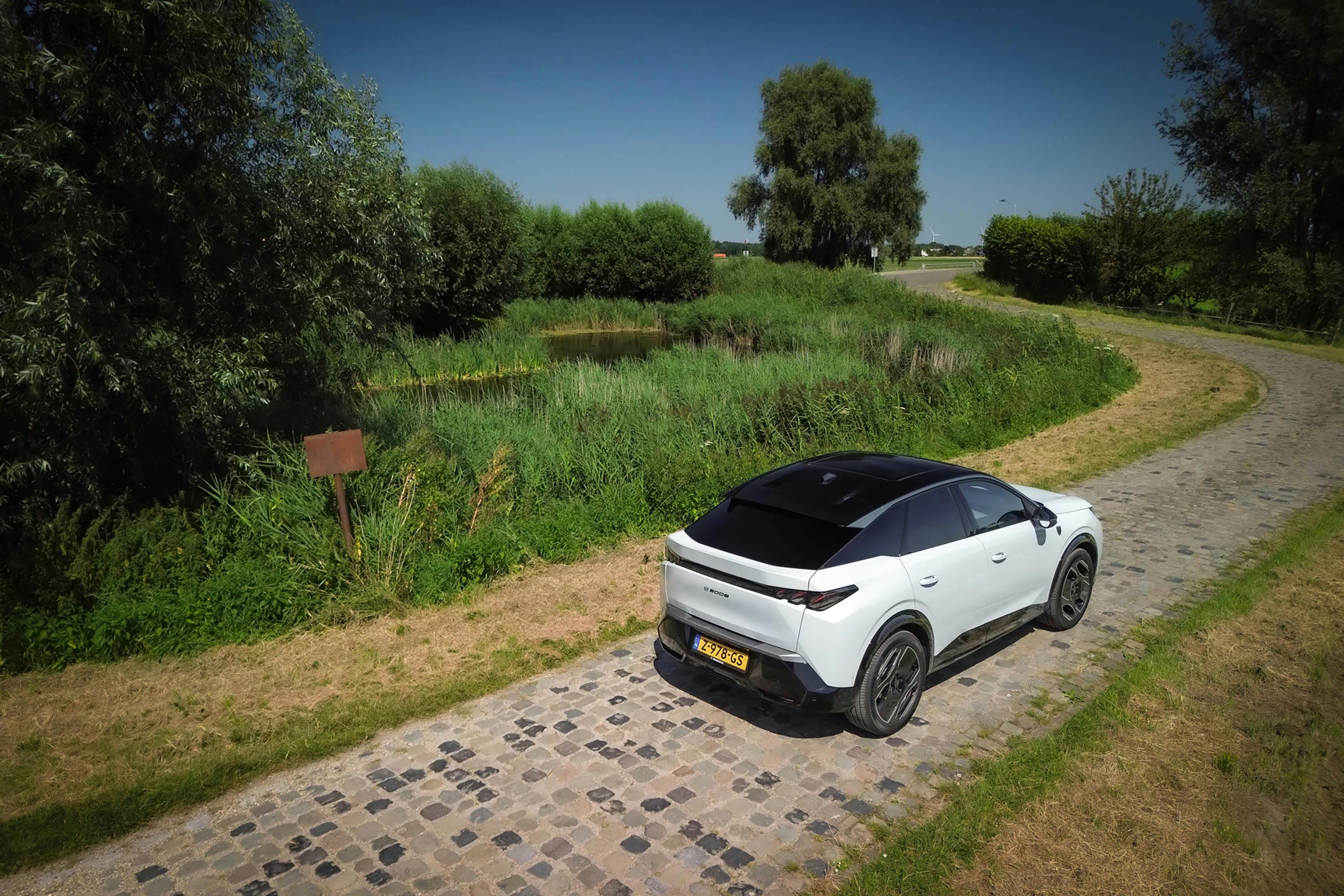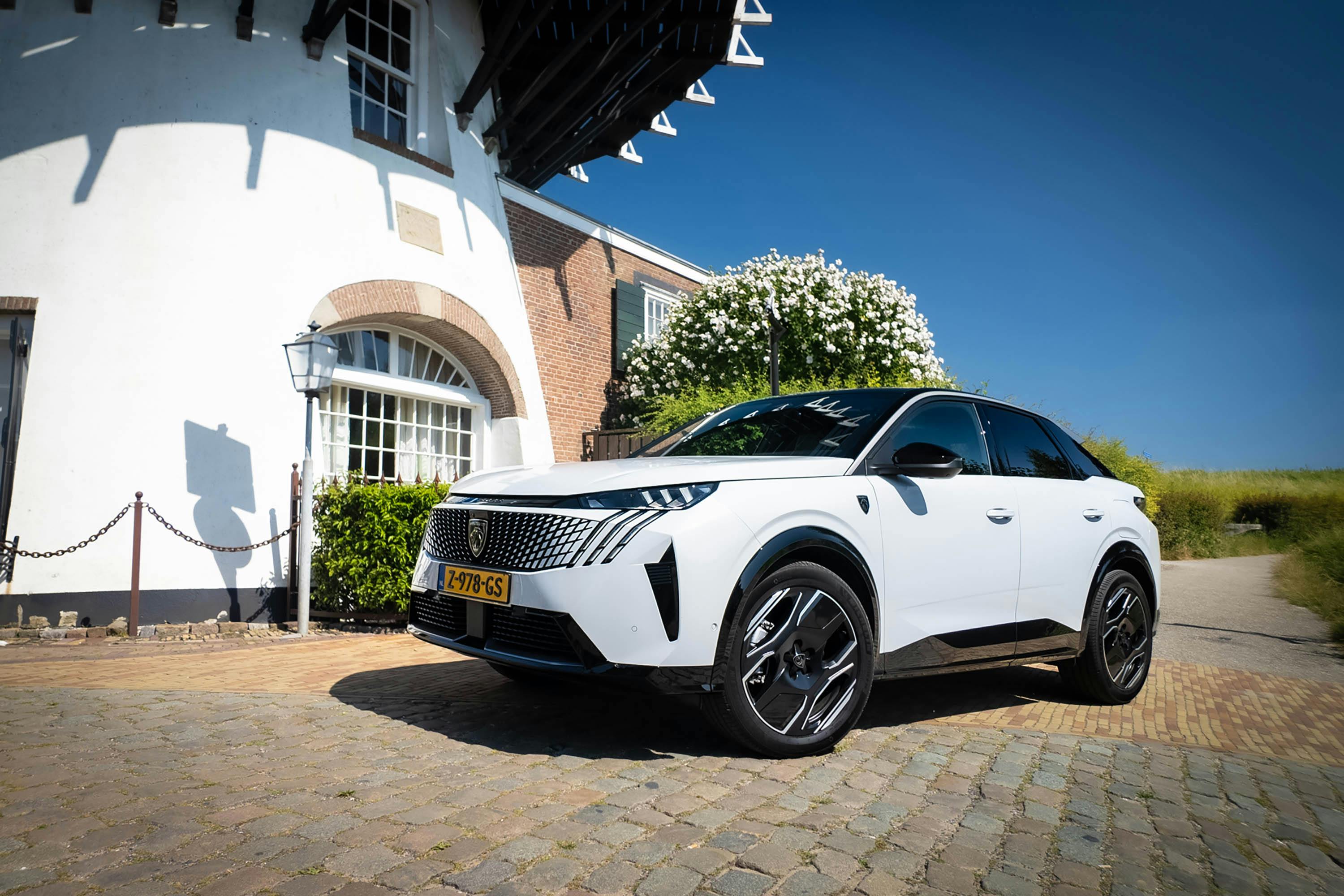 Ook qua rijeigenschappen is de e-3008 een fijne metgezel, want die zijn mooi in balans. Er zit rust in het onderstel, de rechtuitstabiliteit is dik op orde, maar dan wel in combinatie met een fijne directe stuurinstallatie. Op heel korte oneffenheden kan hij soms wat stug zijn, zeker in combinatie met de 20-inch wielen, maar dat blijft allemaal binnen de marge. Het overall karakter van een fijne en goed communicerende fastback-SUV met een dynamische inborst klopt dus.