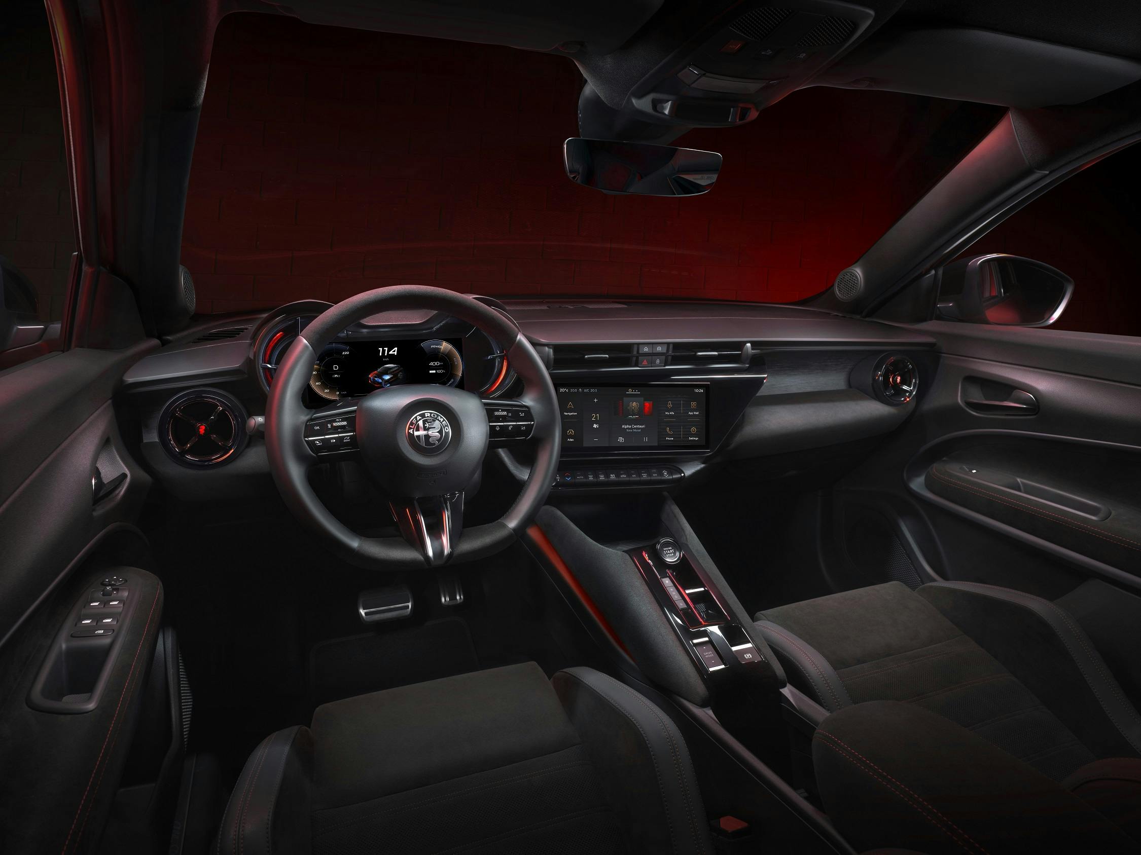 Misschien is dat vanbinnen nog wel meer het geval dan vanbuiten. Ook in de Junior is nu alles digitaal, maar de klassieke dubbele-kokervorm van het instrumentarium vindt zijn oorsprong nog in het analoge tijdperk. Precies zoals de liefhebber van Alfa Romeo dat wenst. Wat verder opvalt, zijn de hoge middenconsole en de geïntegreerde centrale display voor de bediening van alle systemen en multimedia.