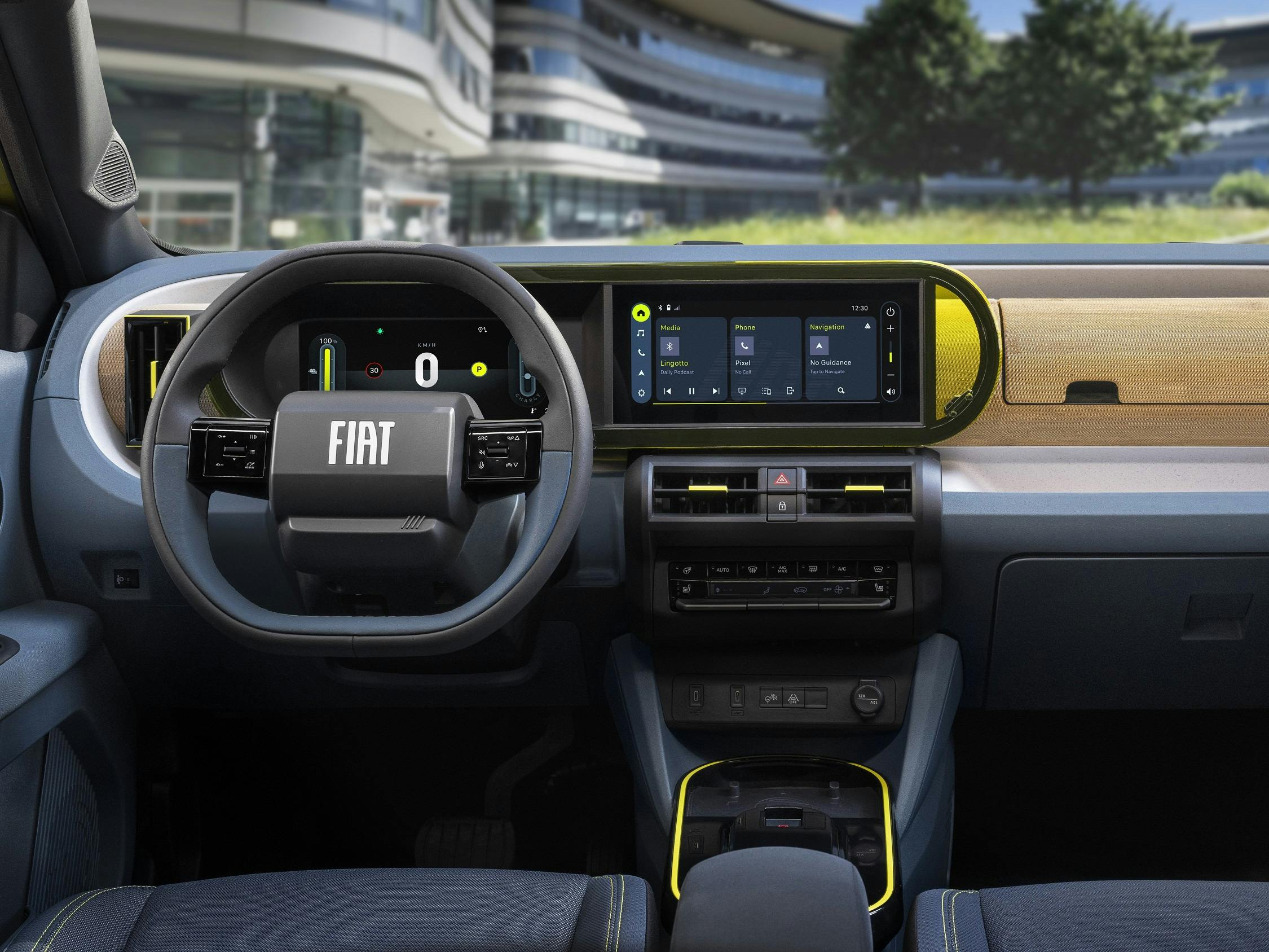 Ook het interieur kent tal van speelse elementen. Kaarsrechte uitstroomroosters voor de ventilatie, details in de kleur van de carrosserie, bekleding van bamboevezels op het dashboard waardoor een houteffect ontstaat, en een oer-Panda als 'Easter egg' in het transparante paneeltje naast het multimedia- en bedieningsscherm. De vierkantjes uit de koplampen en achterlichten keren terug in de stoelbekleding en de vier streepjes op het stuur verwijzen naar het beeldmerk dat Fiat in de jaren 90 gebruikte. De ovale basisvorm van het dashboard en het instrumentarium is een eerbetoon aan de beroemde testbaan boven op het dak van Fiat's oude hoofdkantoor, dat in de Torinese wijk Lingotto nog altijd een belangrijke eyecatcher is.