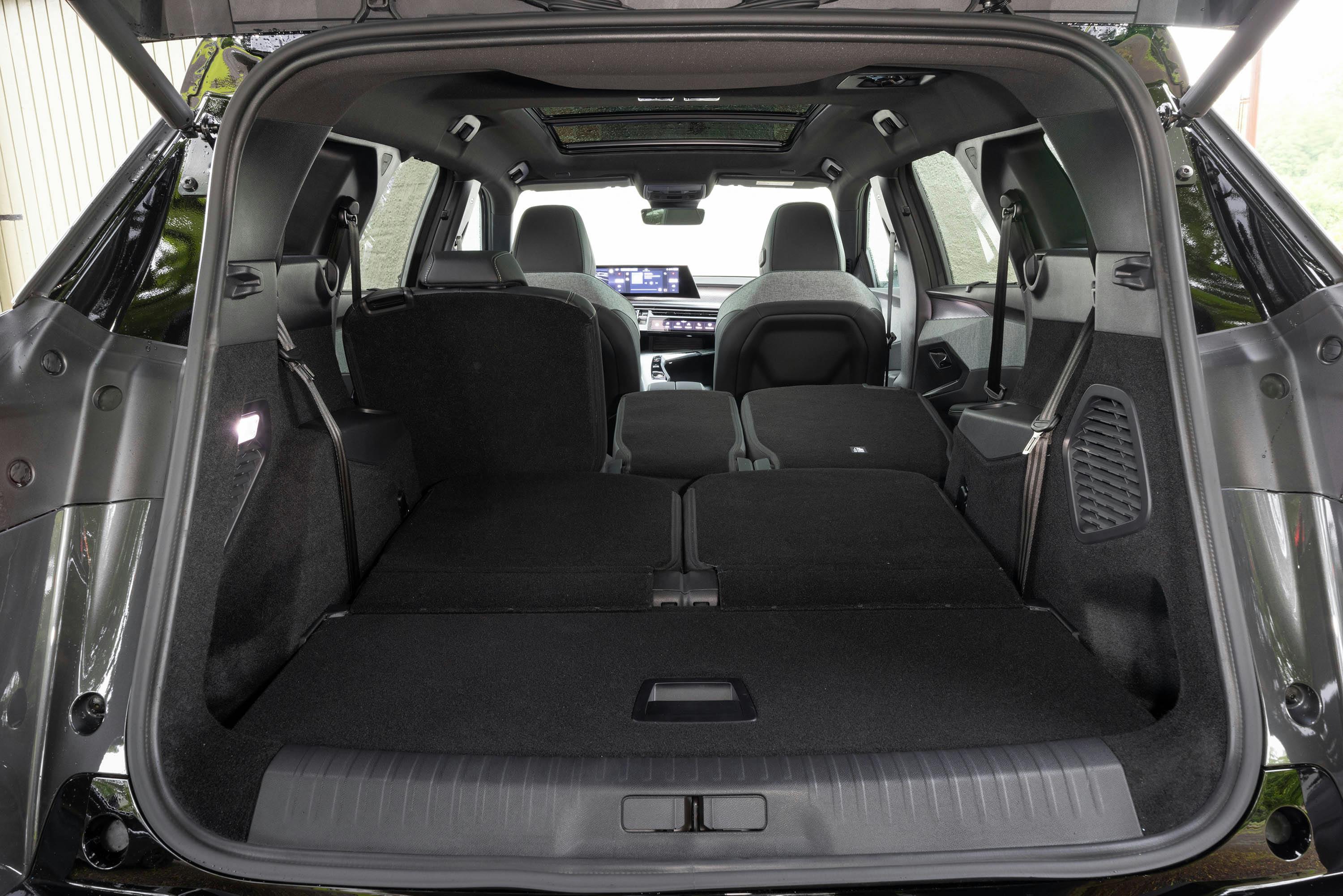 Zelfs met de derde zitrij opgeklapt blijft er voldoende ruimte over voor twee forse boodschappentassen. Een extra diepe bak onder de vloer biedt ruimte voor het opbergen van de afdekrolhoes. Met de derde zitrij neergeklapt ontstaat een inhoud van 740 liter. Klap je alles plat, dan krijg je een volledig vlakke vloer met een totaal van 1815 liter – zo'n 400 liter extra ten opzichte van de E-3008.