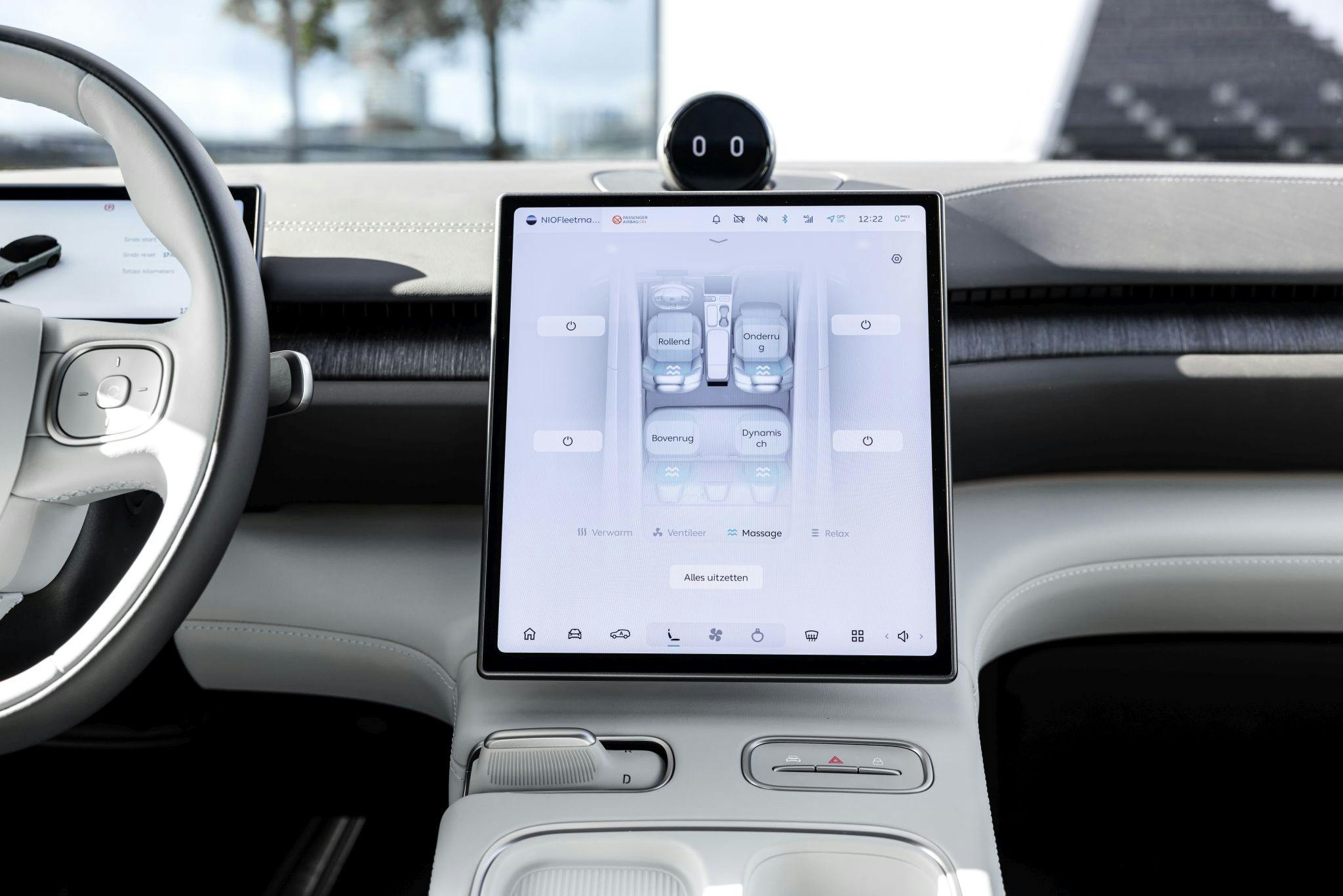 We zien daarnaast de toepassing van duurzame materialen zoals rotan, plantaardig leder en fraaie stiksels die alles bijeenhouden. De aangename sfeer, die mede het gevolg is van de Warm Gravel-kleurstelling, is bijna huiskamerachtig, zij het met een flinke shot high-tech. Zo is ook deze Nio-telg standaard uitgerust met een Smart Cockpit in de vorm van een 10,2-inch oleddisplay recht voor je neus en een 12,3 inch groot en verticaal in het midden geplaatst amoledscherm, dat dient als multimedia- en navigatiesysteem. Over the air-updates verlopen via een 4G-verbinding, evenals die voor de techniek van de auto. O, en er is standaard een 4K-dashcam. En dan hebben we nog een heleboel niet genoemd.