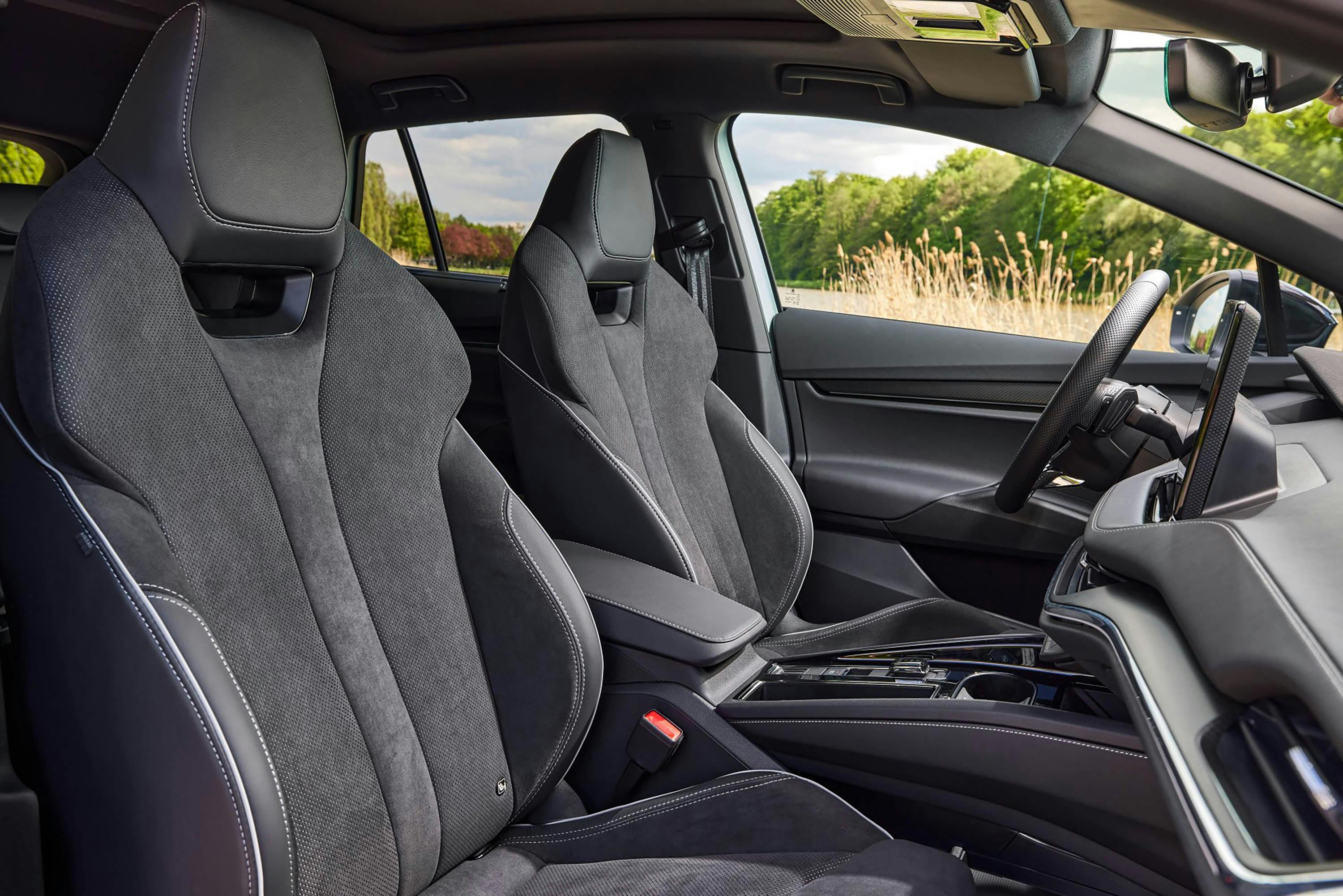 Aan boord is de opgefriste Enyaq om te beginnen een erg comfortabele auto, zeker qua instap. Precies goed op heuphoogte betreed je de koets om vervolgens te genieten van een heerlijk comfortabele zit. Dat is vooral te danken aan de geweldige Sportline-stoelen en het comfort van het eerdergenoemde pakket. Dat voegt namelijk ook een prima massagefunctie toe, evenals elektrische stoelverstelling inclusief geheugen. Bovendien zijn de stoelen te verwarmen, en dat is de achterbank eveneens. Een goede zitpositie en dito ondersteuning zijn dan ook snel gevonden, en dat komt ook zeker op het conto van het uitstekend verstelbare stuurwiel.