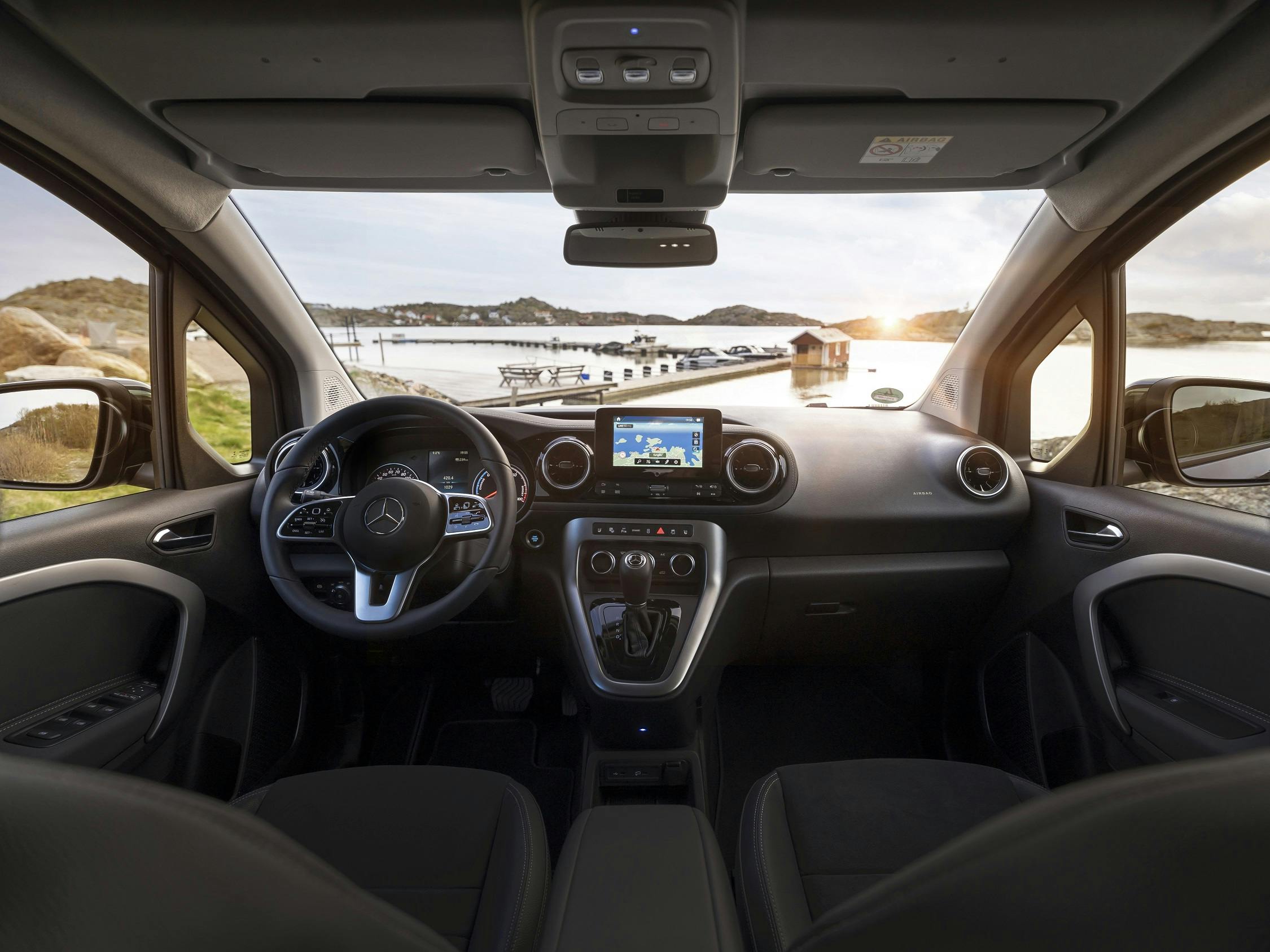 De Mercedes-Benz EQT mag dan op de Renault Kangoo zijn gebaseerd, vanaf de bestuurdersstoel merk je daar nauwelijks iets van. De EQT heeft een heel ander dashboard, waarin de voor Mercedes kenmerkende ronde ventilatieroosters van de ventilatie en het 'zwevende' MBUX-multimediasysteem voor de nodige verschillen zorgen. Dit MBUX-systeem is een vereenvoudigde versie van het bedieningsconcept dat bekend is uit de personenauto's van het merk. Belangrijke functies kunnen met gesproken opdrachten worden geactiveerd door 'Hé Mercedes' te zeggen. Dat werkt heel gebruiksvriendelijk.