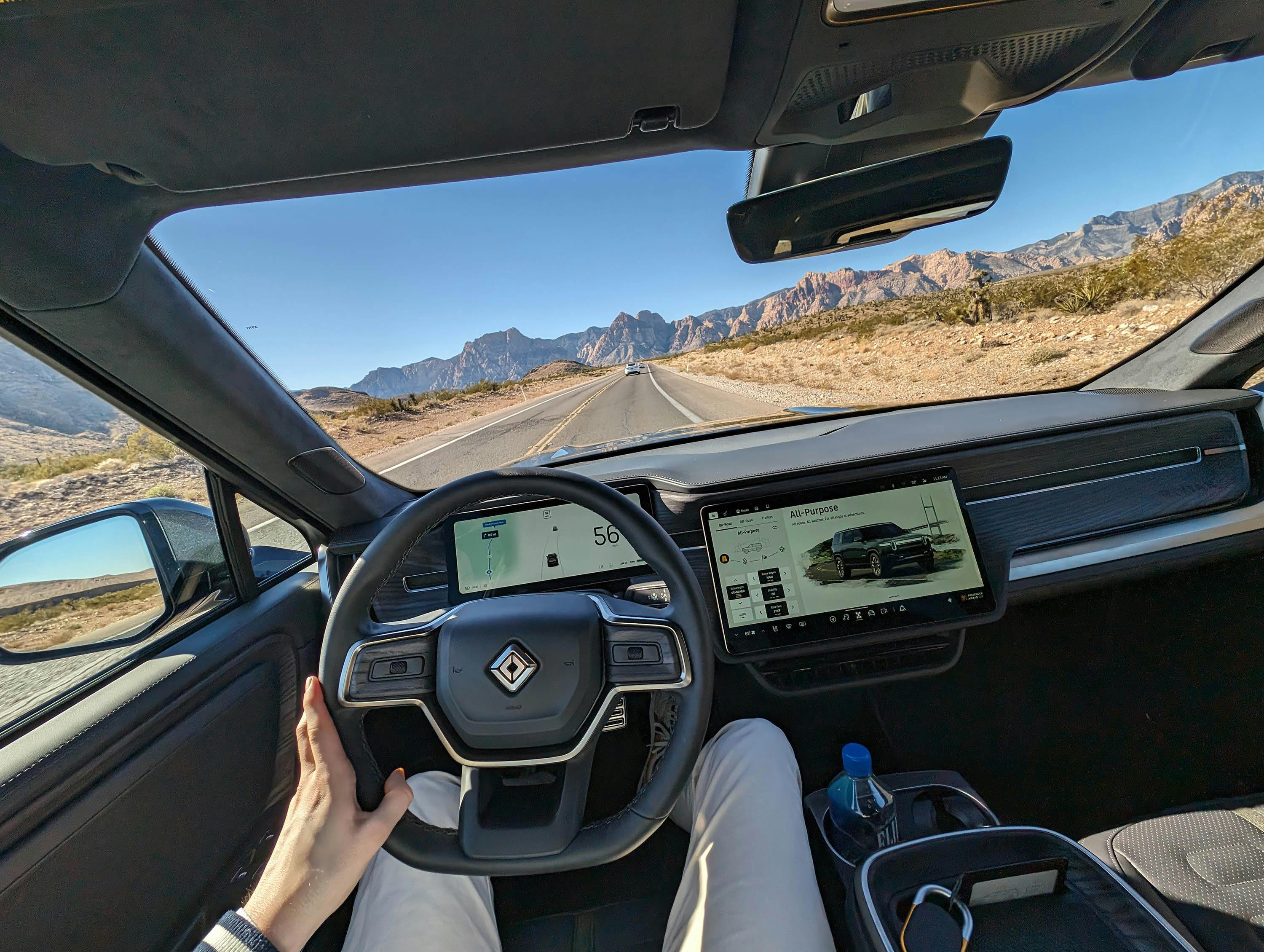 Naast dat de R1S minder groot oogt dan-ie daadwerkelijk is, voelt de auto van achter het stuur ook niet zo kolossaal. Toegegeven: de brede Amerikaanse wegen dragen daar vast aan bij, maar toch ontbreekt het gevoel dat je erg hoog op de bok zit met veel lucht om je heen.