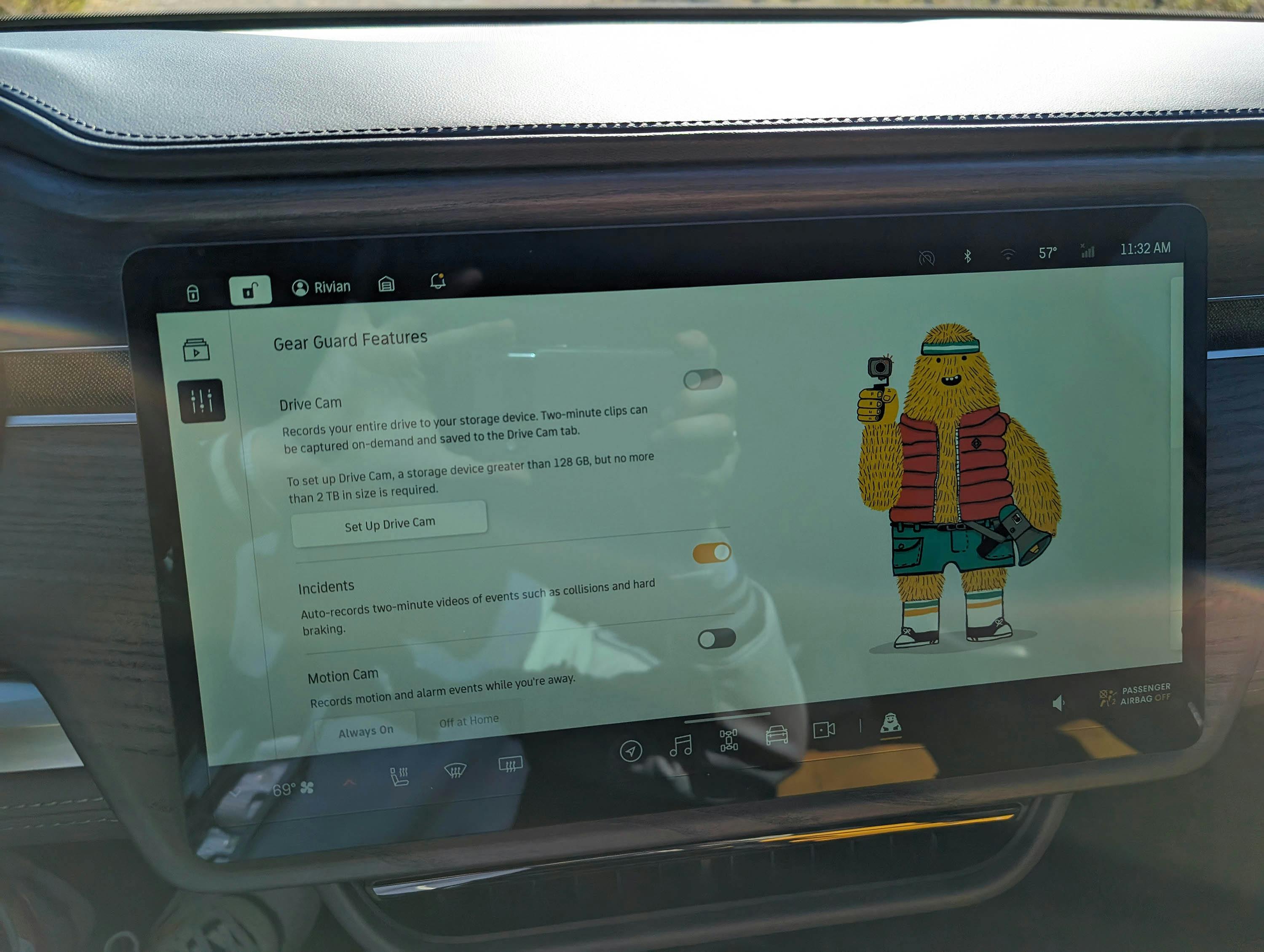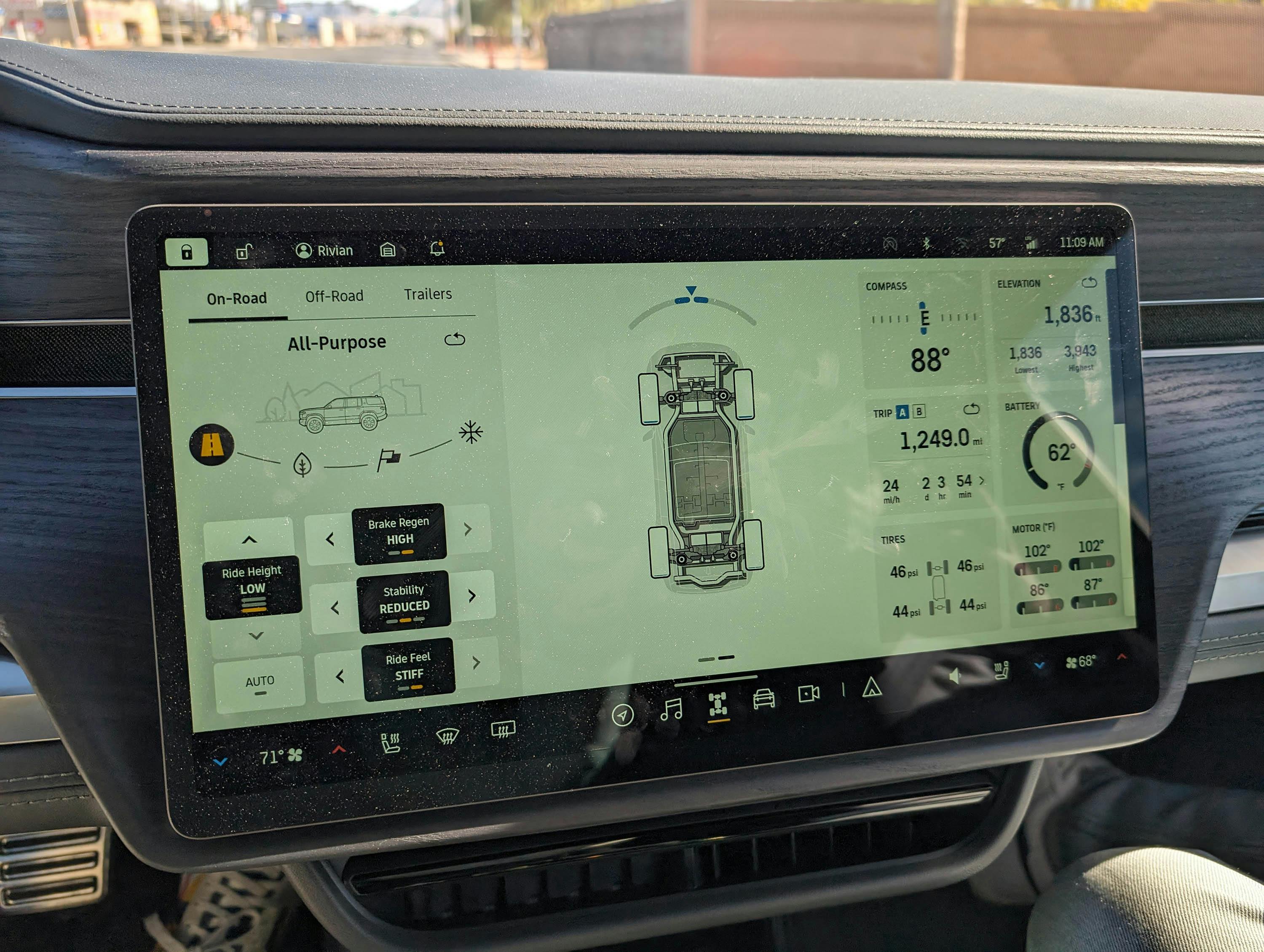 De menu's op het centrale infotainmentscherm zijn overzichtelijk en netjes, met tal van leuke animaties waarin je de R1S virtueel ziet, evenals Gear Guard, een soort gele vriendelijke bigfoot die symbool staat voor Rivians beveiligingssysteem. Je kunt gemakkelijk wisselen tussen de verschillende rijinstellingen, afhankelijk van de situatie op de weg. De echte liefhebber kan zich laten overladen met data en feitjes, van de exacte bewegingen van de wielen tot de temperatuur per elektromotor. Geinig, maar alleen relevant als je bijvoorbeeld de woestenij in gaat.