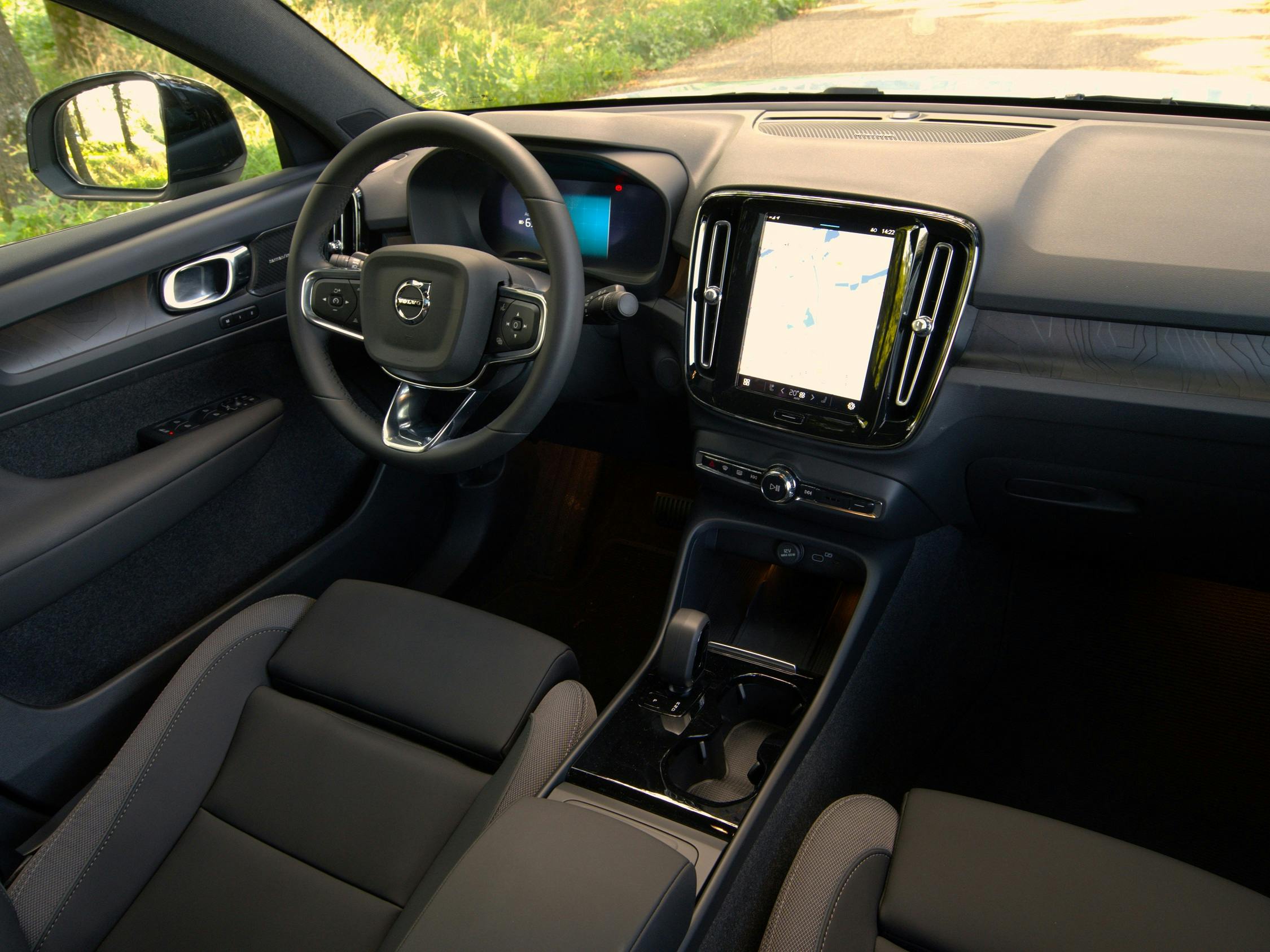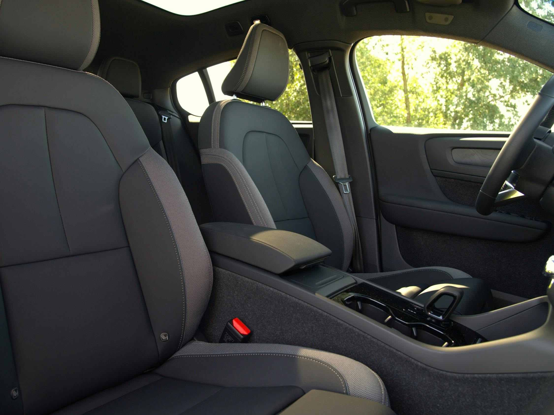 De stoelen van de EC40 zitten heerlijk – zoals het een Volvo betaamt. Ze bieden een comfortabele combinatie van relatief zachte kussens en een goede ondersteuning van je rug en zitvlak. Na een urenlange rit stap je wakker uit. In onze testauto zijn de stoelen bekleed met zwarte microtech-bekleding, die is afgebiesd met banen van textiel. Maar je kunt ook kiezen voor zwart suède in combinatie met blauw tapijt of voor lichtgrijze wol.