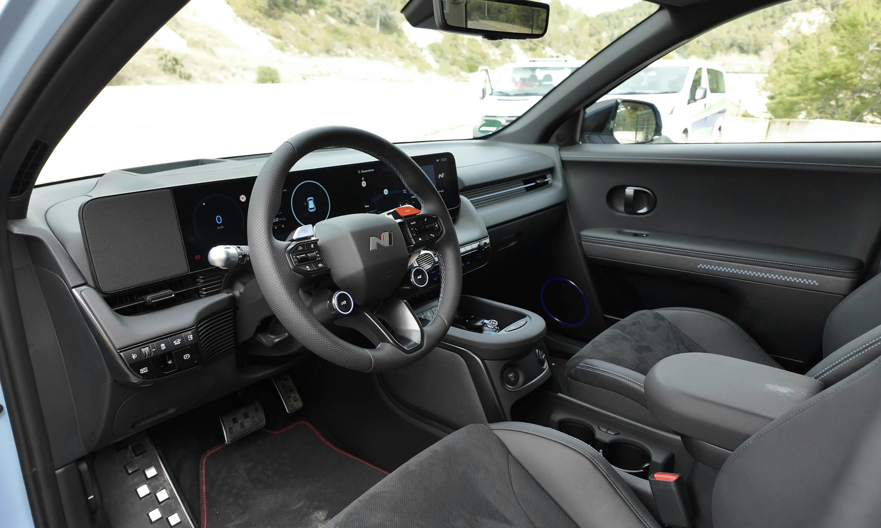 Het meest in het oog springend zijn echter de uitnodigende kuipstoelen met een in het donker verlicht N-logo. Deze zijn standaard bekleed met alcantara en voor extra comfort verwarmd (net als het stuur), maar ook geventileerd. Blauwe N-stiksels en details doen de rest, evenals het fantastisch in de hand liggende N-stuurwiel met daarop diverse schakelaars.
