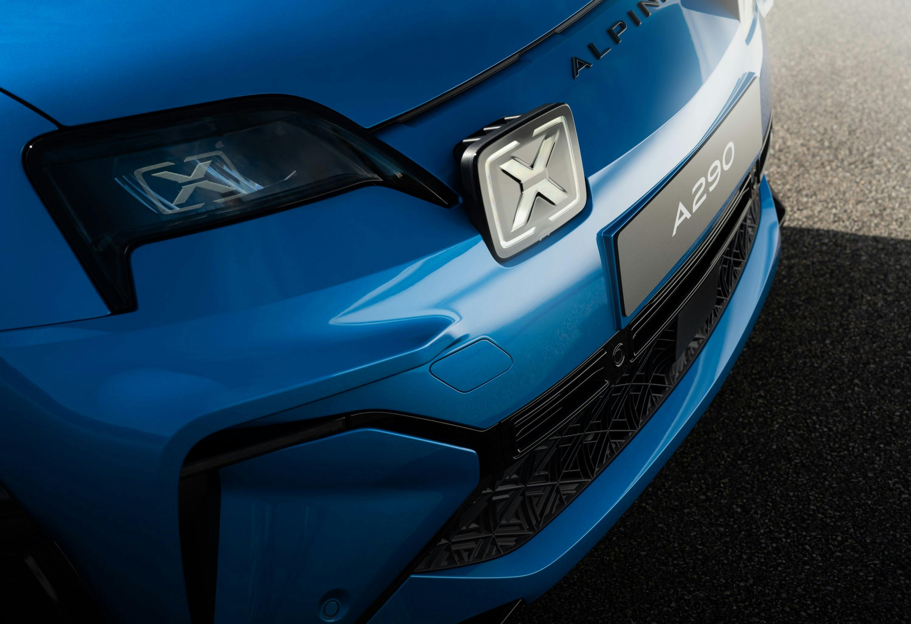 We zien de nieuwe Alpine A290 voor het eerst in een studio in het hart van Parijs. Er staat een behoorlijk potig karretje dat direct duidelijk maakt dat je niet met 'm moet sollen. De Renault-basis oogt weliswaar bekend, maar daar blijft het ook bij. De A290 beschikt niet alleen over een stel direct in het oog springende rallylampen met X-patroon, maar vooral over 6 centimeter meer spoorbreedte. Dat zorgt voor een krachtige stance, en al helemaal in combinatie met een optische verbreding dankzij de sideskirts. Verder rolt-ie standaard op 19-inch lichtmetalen wielen en zien we aan de achterkant optische details die refereren aan de A110.
