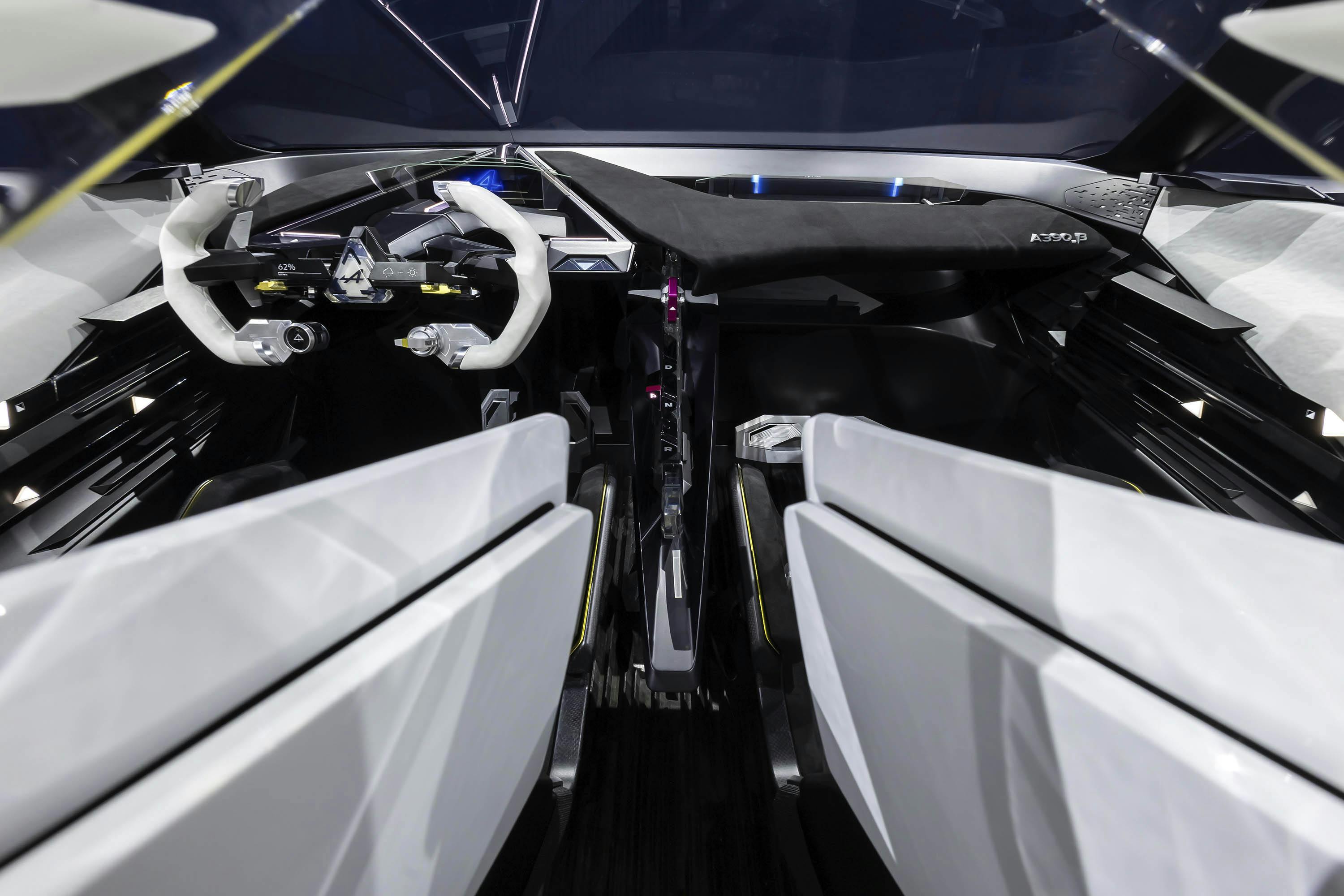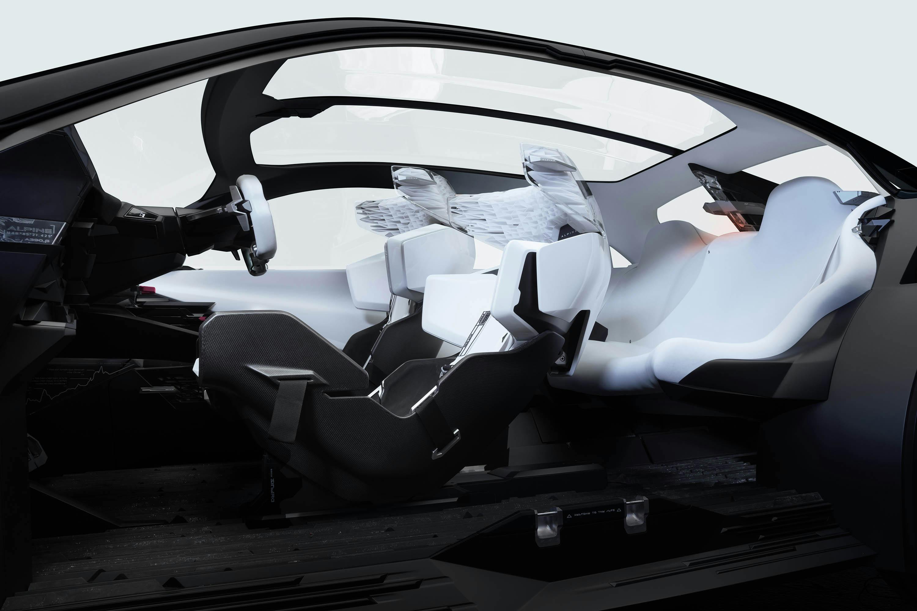 Volgens Alpine leunt het uiteindelijke design voor zo'n 85 procent op het studiemodel, maar dit geldt niet voor het interieur. Wellicht dat een bepaald vezeltje of designdetail het eindstadium zal halen, maar dit is echt te futuristisch. Alpine is actief in de Formule 1 en met één druk op de knop verandert de stoelpositie van standje comfort en praktisch naar een meer liggende racemodus.