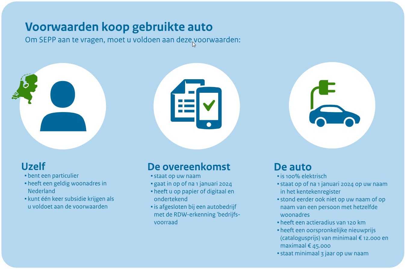 Bij de aanschaf van een nieuwe EV kan aanspraak worden gemaakt op een aanschafbonus van 2.950 euro. Voorwaarde is dat de auto een nieuwprijs heeft van boven de 12.000 euro. Wanneer de auto een catalogusprijs heeft van meer dan 45.000 euro, komt u de koper niet in aanmerking voor SEPP-subsidie. Tevens dient de auto een elektrische actieradius (WLTP) van ten minste 120 kilometer te hebben. De auto waarvoor subsidie is aangevraagd, dient op naam te staan van de aanvrager en moet na 1 januari 2024 te zijn ondertekend. De auto moet 3 jaar op naam blijven staan van de eerste koper (gerekend vanaf datum 1e registratie). Indien u echter besluit uw EV binnen deze termijn weer te verkopen, zult u een deel van de SEPP-subsidie terug moeten betalen.