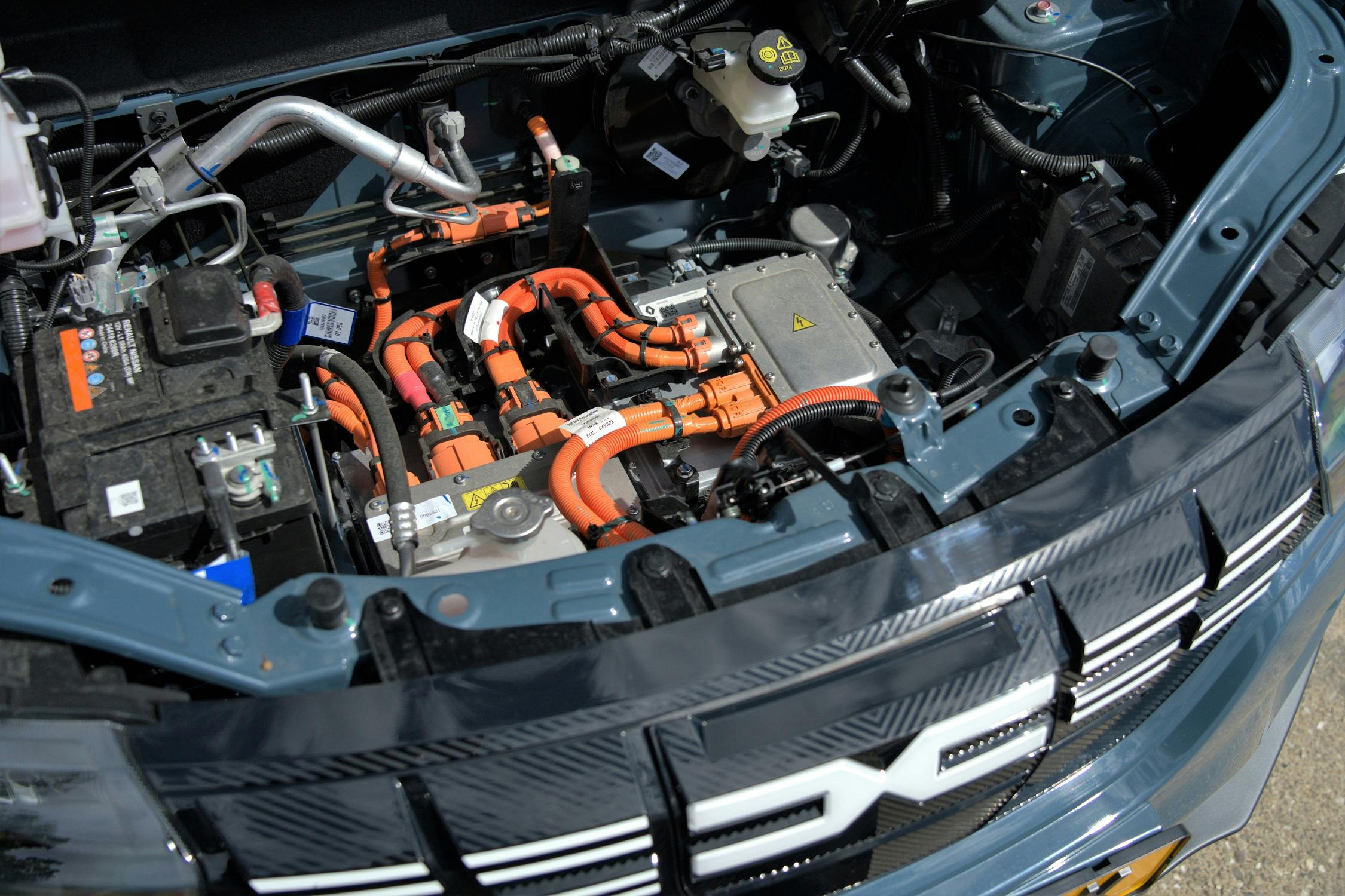 De elektromotor huist voorin. Doordat Dacia het maximumtoerental van de elektromotor heeft verhoogd, kon het vermogen met 48 procent worden opgeschroefd een welkome ‘boost’ om snel(ler) uit de startblokken te komen. Wat het extra vermogen met de prestaties doet, laat de folder zien.