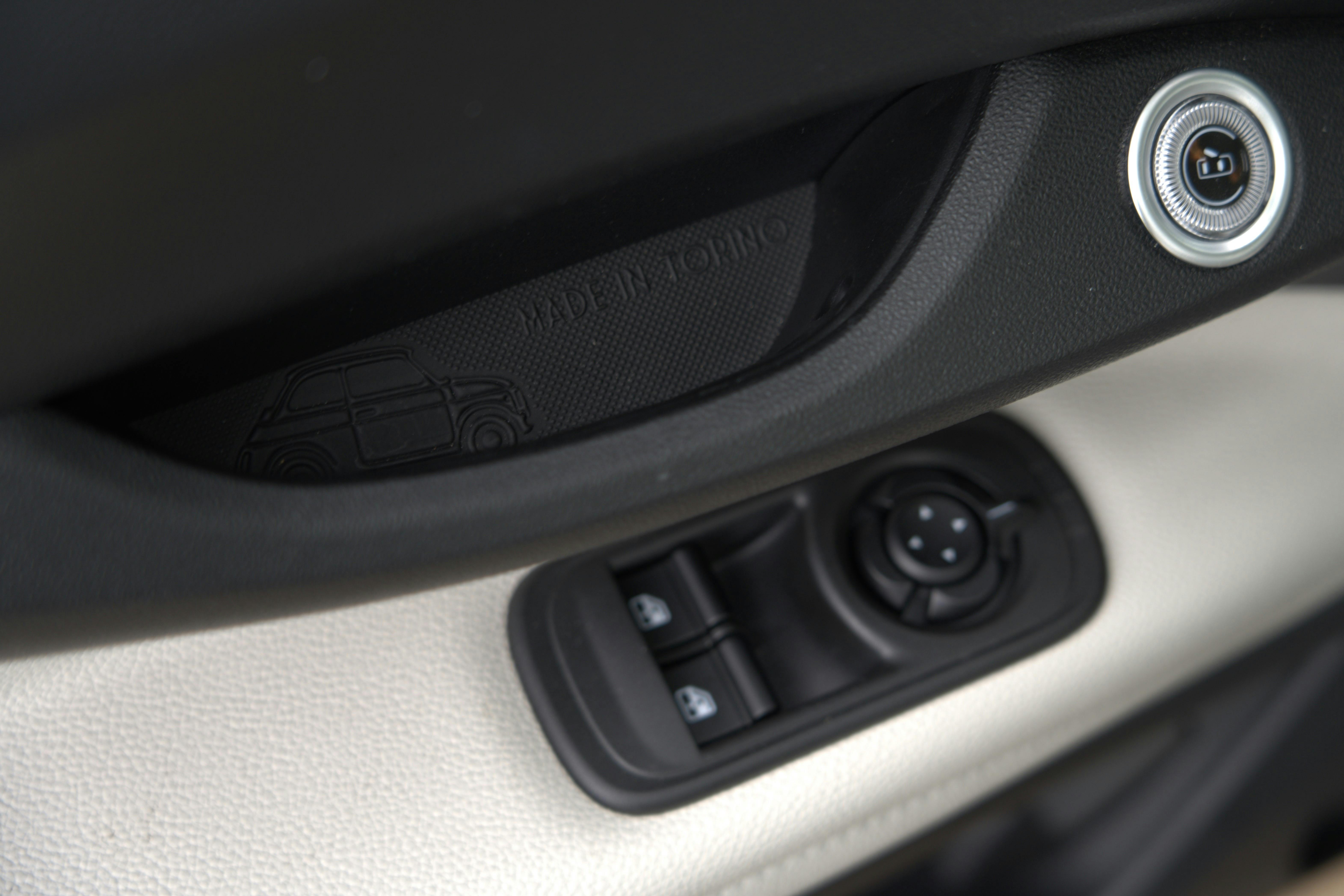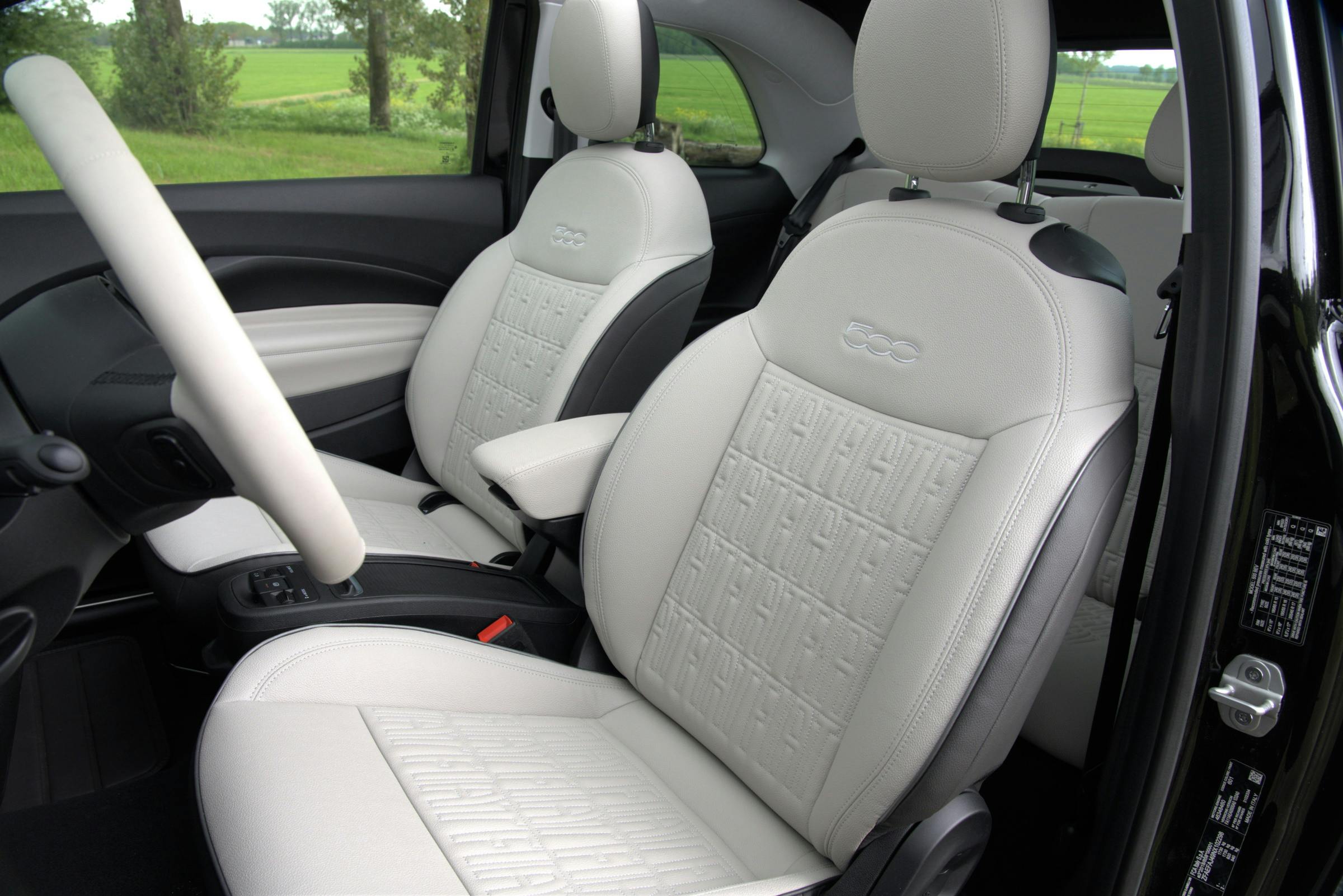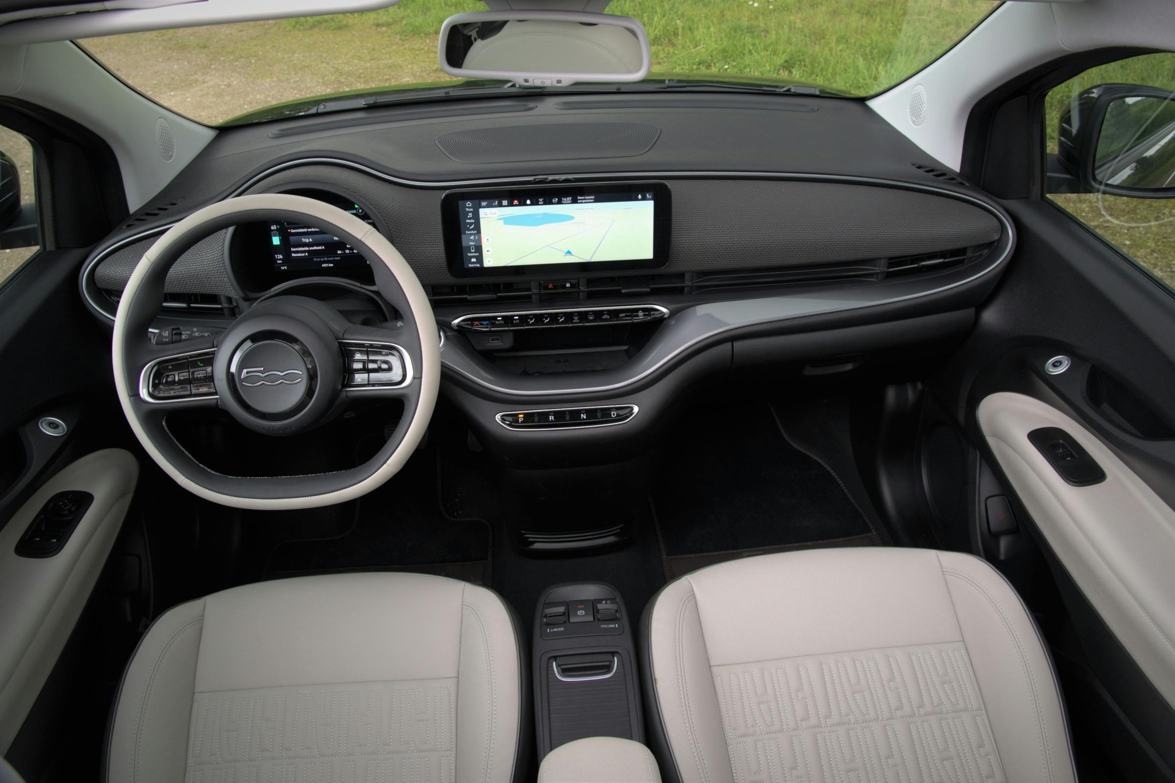 Ook het interieur is een wereld van verschil. In de 500e is de digitalisatie niet meer te keren. Met uitzondering van instapversie Red, is in het midden van het dashboard een 10,25-inch touchscreen gemonteerd, met eenvoudig te bedienen functies. Ook achter het stuur is de informatievoorziening helemaal digitaal. Gelukkig zitten er wel echte knoppen voor de airco onder het scherm. Een versnellingspook ontbreekt uiteraard: je hebt vier drukknoppen waarmee je de rijrichtingen, neutraal en parkeerstand kiest. Door het ontbreken van een pookconsole ontstaat wat meer beenruimte. Afhankelijk van de gekozen uitvoering wordt het dashboard afgewerkt met in carrosseriekleur gelakte sierlijsten of met een reliëfpatroon. Wij testten de 500e Cabrio in de duurste uitvoering La Prima by Bocelli, waarin stoelen en stuur met chic tweekleurig kunstleer zijn bekleed. Kijk je nog verder, dan ontdek je geinige details, zoals de in het leer gestikte Fiat-logo’s en subtiele ‘Easter eggs’ die verwijzen naar de geschiedenis van de 500. Let bijvoorbeeld op het ‘Rugzakje’ in de deurgrepen en op de skyline van Turijn in het bakje onder de aircoknoppen.