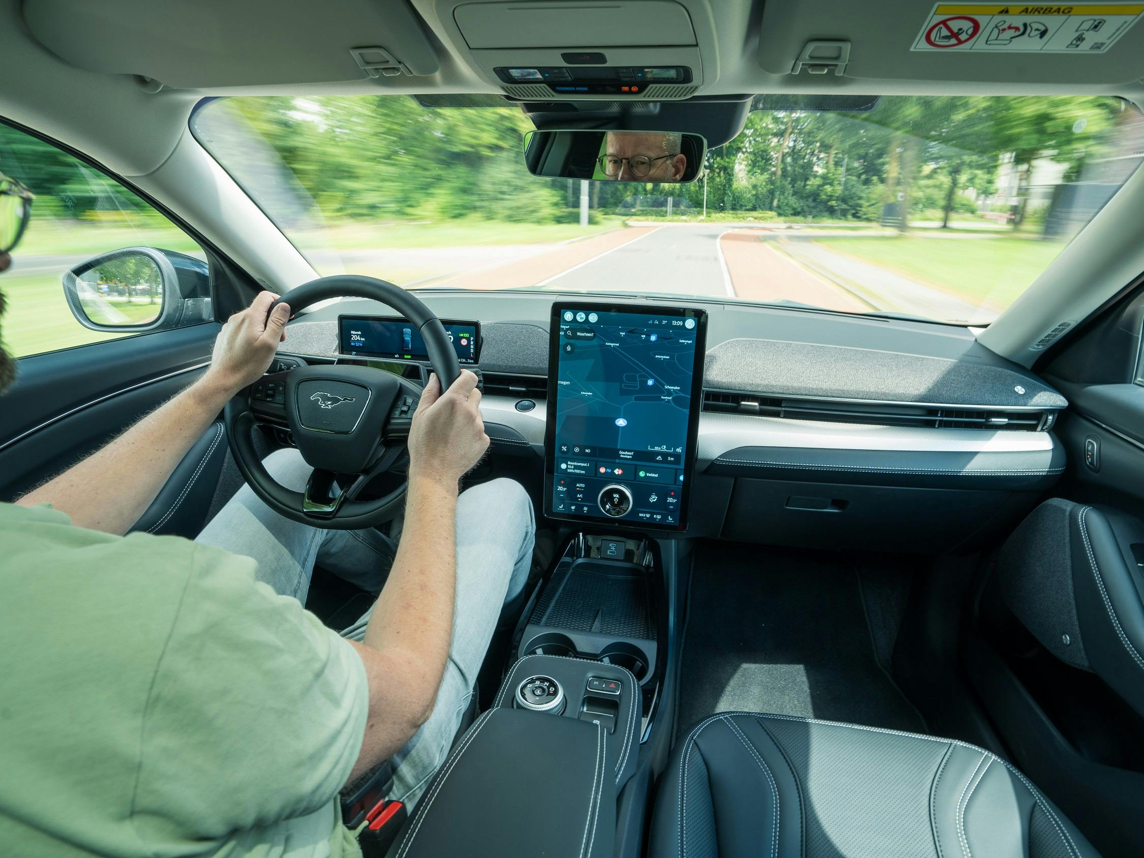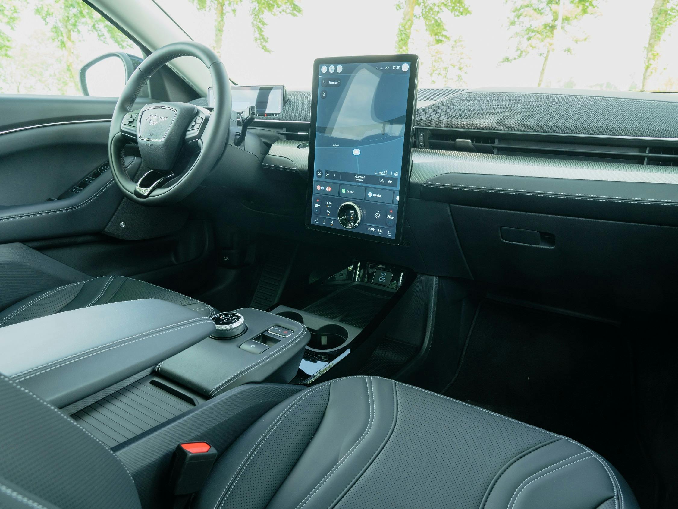 Wat niet wil zeggen dat de Mustang Mach-E immuun is voor veroudering. Dat zie je vooral aan de binnenzijde. Vijf jaar geleden was het grote centrale touchscreen ronduit spectaculair, inmiddels hebben andere merken betere en vooral modernere oplossingen voor de bediening gevonden. Het scherm ligt plat tegen het dashboard en loopt ver naar beneden door, waardoor je er vanaf de bestuurdersstoel – mede door het formaat – in een beetje vreemde hoek tegenaan kijkt. Ongetwijfeld een kwestie van wennen, maar vergeleken met de gebogen of naar de bestuurder gerichte displays die we bij veel jongere EV's tegenkomen, laat de Mustang Mach-E doorschemeren dat hij niet helemaal meer de jongste is.