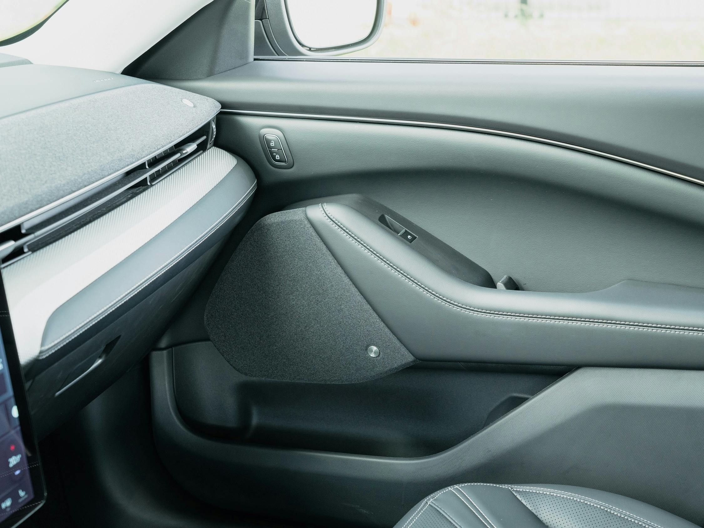 Het lukt de toegepaste materialen van het interieur nog maar net om het verouderingsproces van de auto te verbloemen. Harde plastics worden afgewisseld met vrij glad en ietwat glimmend kunstleer op de stoelen en diverse panelen, dat echter is voorzien van een fraai stiksel in een contrasterende kleur. De Mustang Mach-E verloochent zijn Amerikaanse afkomst niet – de Europese concurrentie gebruikt vaak mooiere materialen.