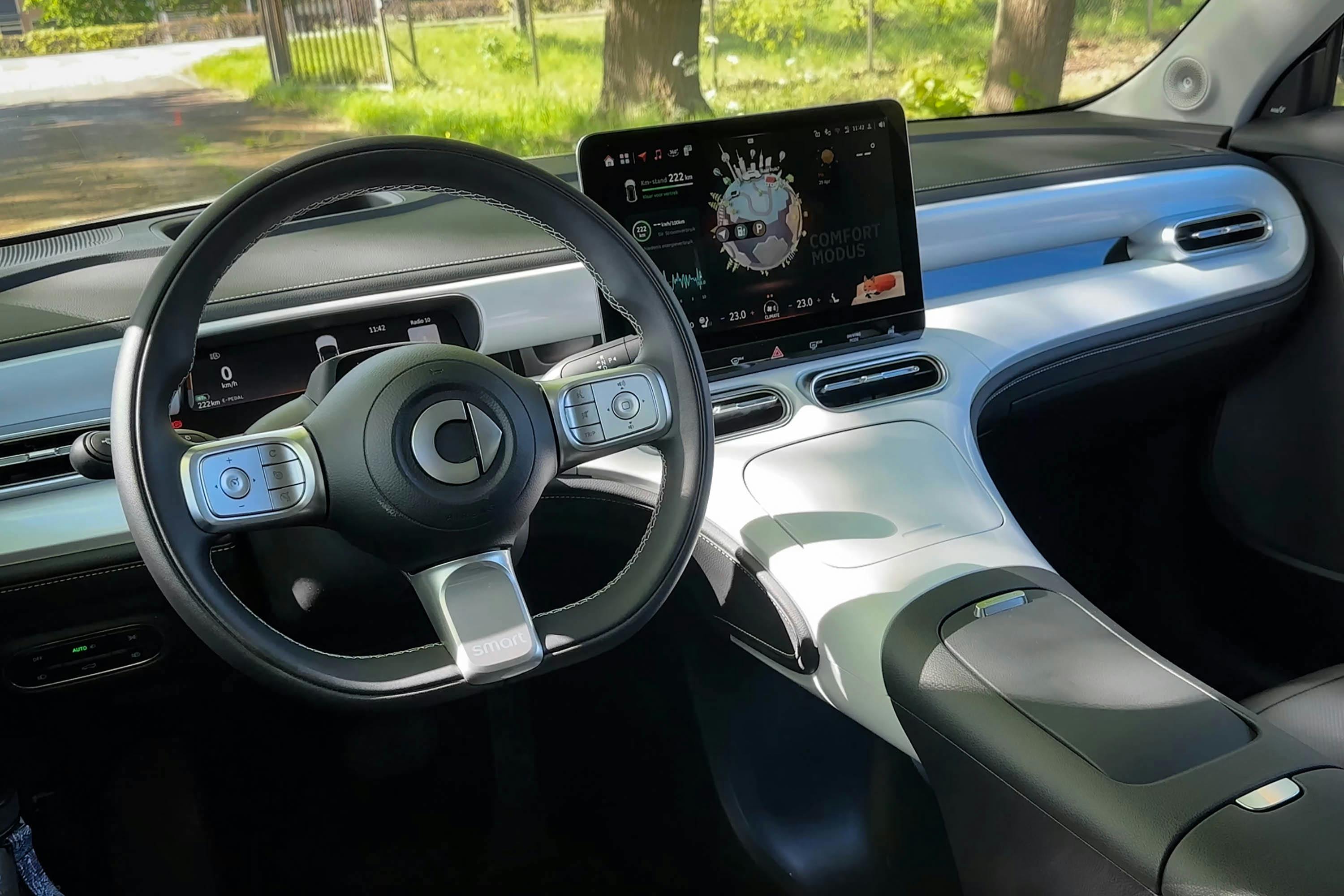 Voor de rest wordt het interieur gekenmerkt door de aanwezigheid van twee grote displays. Eentje recht voor je neus bijvoorbeeld. Niet al te groot, maar vrij doeltreffend als het aankomt op het tonen van alle cruciale informatie. Daarentegen is het centraal geplaatste infotainmentsysteem fors: 12,8 inch in totaal en uitgerust met Smarts eigen software. Live-navigatie met EV-routeplanning is standaard, net als wireless Apple CarPlay en Android Auto.