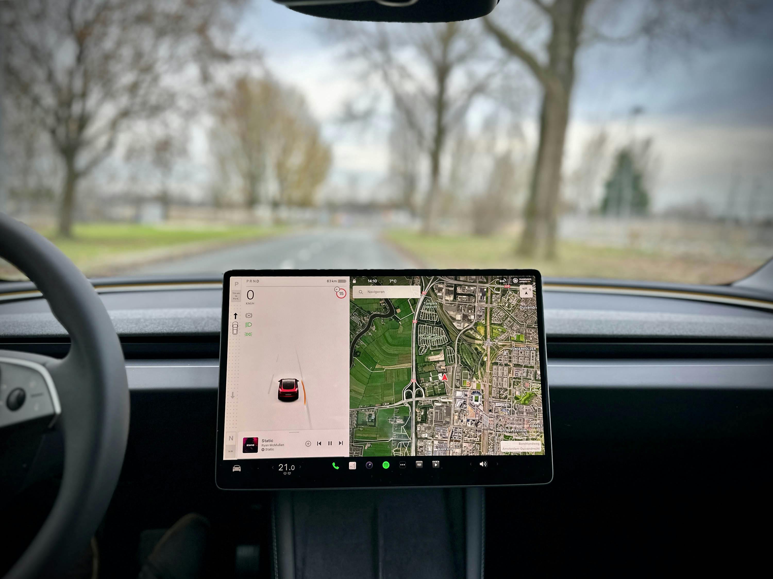 Het selecteren van de voor- of achteruitversnelling gaat daarnaast via het 15,4-inch touchscreen. En ook dat went snel, zij het dat Tesla dit deels heeft geautomatiseerd. De auto herkent namelijk de situatie van waaruit je vertrekt. Sta je met de neus naar een muur of hekwerk geparkeerd, dan geeft-ie direct de suggestie om achteruitrijdend te vertrekken. Een simpele bevestiging door een keer extra op het rempedaal te drukken is dan voldoende om de achteruitversnelling in te schakelen. Een feature die in de praktijk werkelijk feilloos werkt. Een knap stukje engineering!