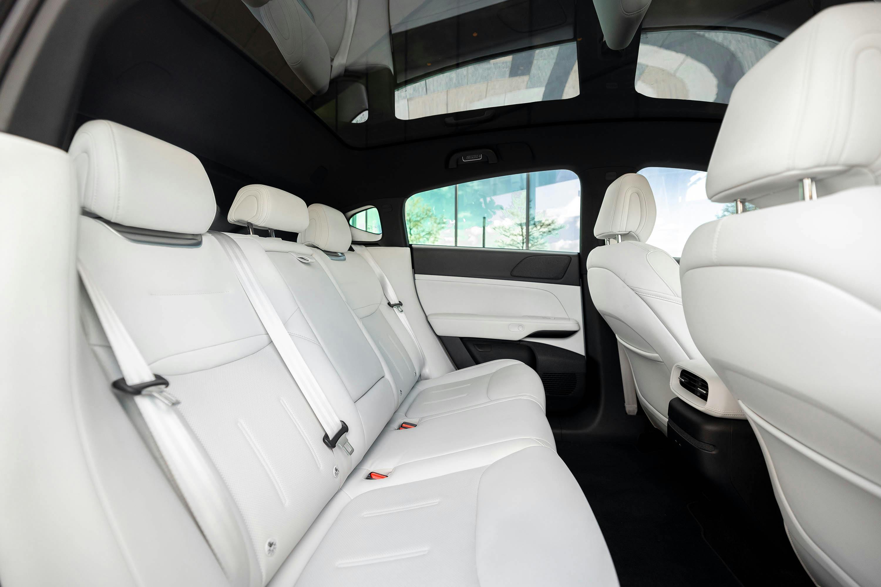 Op de tweede zitrij is de G6 minstens zo overtuigend. Sterker nog, daar ontpopt de auto zich als een van de comfortabelste in zijn klasse. We zien niet alleen een fijne instap, maar ook een goed gevormde en vrij hoog geplaatste achterbank, zeeën aan been- en voetruimte, en ook de hoofdruimte is ronduit royaal. Het gloednieuwe EV-platform maakt een vlakke vloer mogelijk en de neerklapbare middenarmsteun verschaft je twee extra bekerhouders. Twee usb-c-aansluitpunten zorgen voor eindeloos smartphone- of tabletvertier.