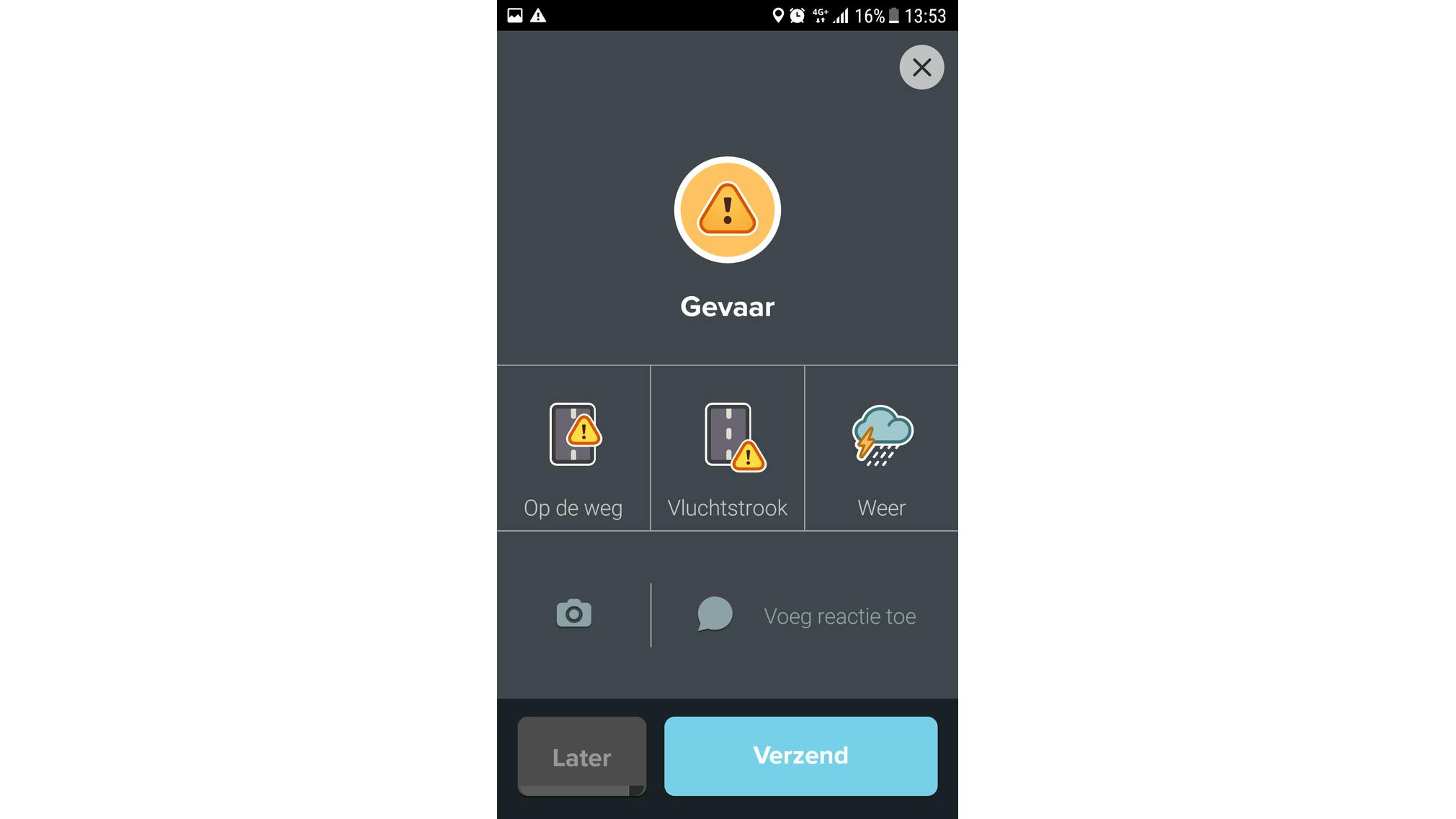 Als Waze-gebruiker heb je ook een actieve rol. Het is belangrijk dat je niet alleen informatie consumeert, maar ook zelf situaties meldt. Zeker bij onverwachte gebeurtenissen voor je neus, zoals een ongeval. Druk dan – zodra dat veilig kan – op het oranje icoon rechtsonder. Hier kun je aangeven dat er een file is ontstaan, een ongeluk is gebeurd of er een ander gevaar is.