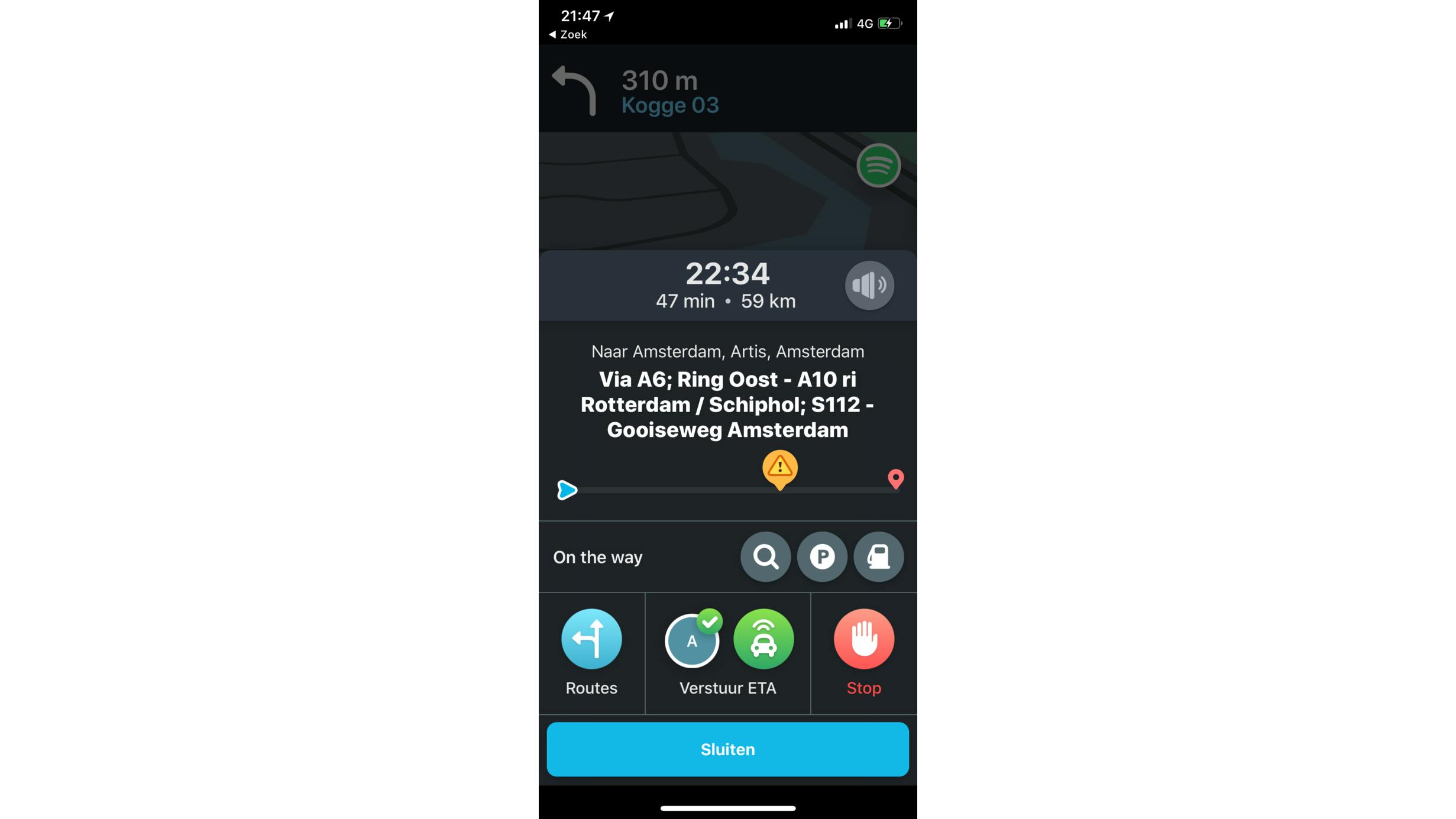 De sociale functies van Waze helpen je ook bij het plannen van een route. Stel, een andere gebruiker meldt gevaar op je geplande route. Dan verschijnt er een waarschuwingssymbool op het traject. Je weet meteen dat er iets aan de hand is, zoals een ongeval of wegwerkzaamheden.