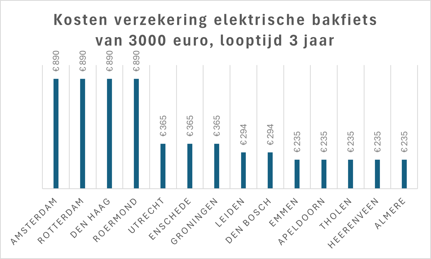 Als je een verzekering voor je elektrische bakfiets zoekt op internet, moet je twee gegevens altijd invullen: de waarde van de fiets en je postcode. Die twee factoren zijn bepalend voor de verzekeringspremie. Woon je in een grote stad in de Randstad, dan heb je pech. Maar ook in een Limburgse stad als Roermond kun je met zeer hoge premies te maken krijgen. In minder dichtbevolkte gebieden, zoals Emmen of Tholen, liggen de premies stukken lager, zoals in onderstaande grafiek is te zien.