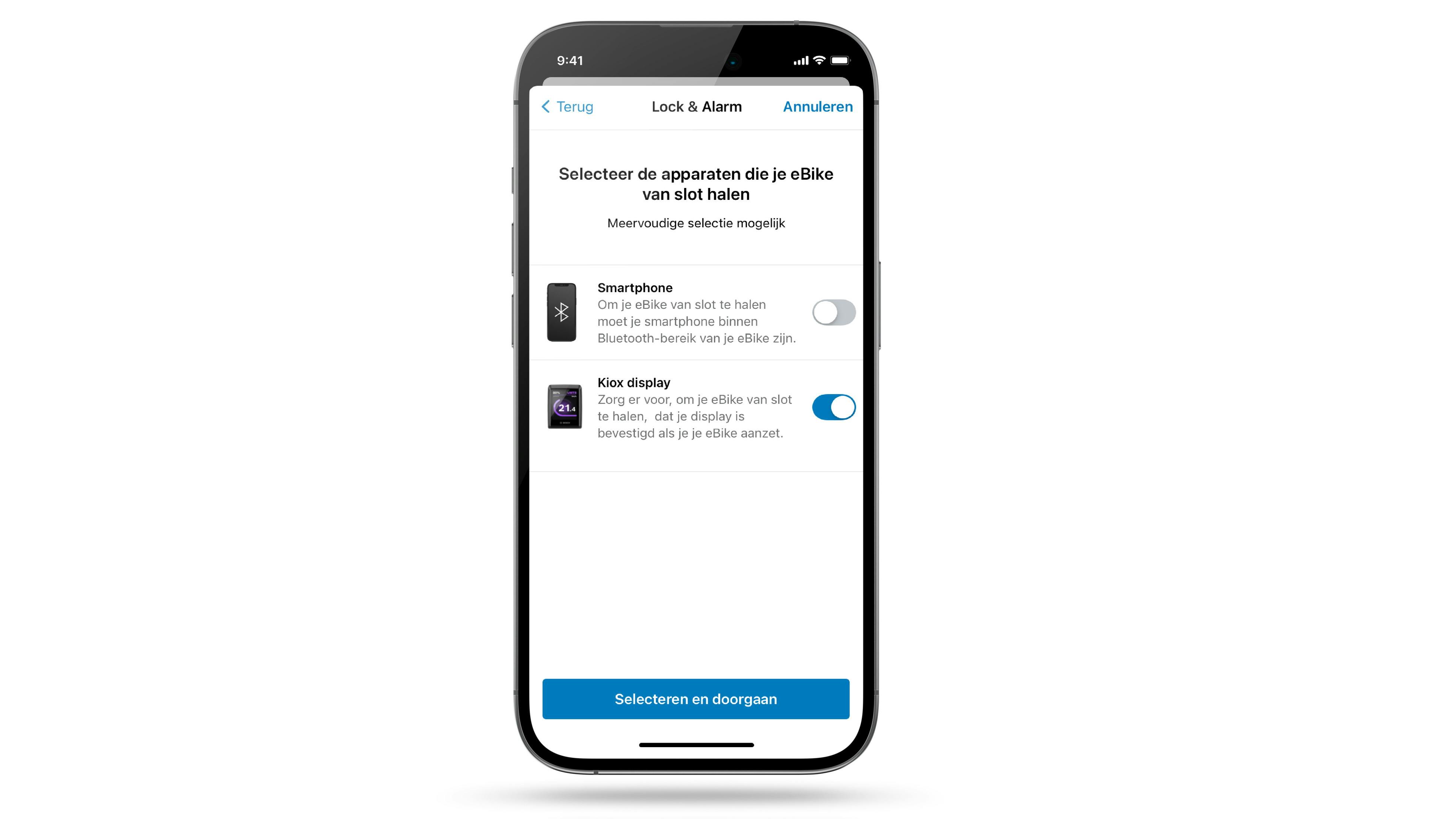 Om de lockfunctie weer te ontgrendelen, zet je de e-bike aan en zorg je ervoor dat je mobiele telefoon in de buurt is. De eBike Lock-functie zal het systeem direct ontgrendelen en de e-bike is weer klaar voor gebruik. Bij verlies van je mobiele telefoon log je gewoon in op een andere telefoon met het account van je eBike Flow-app.
