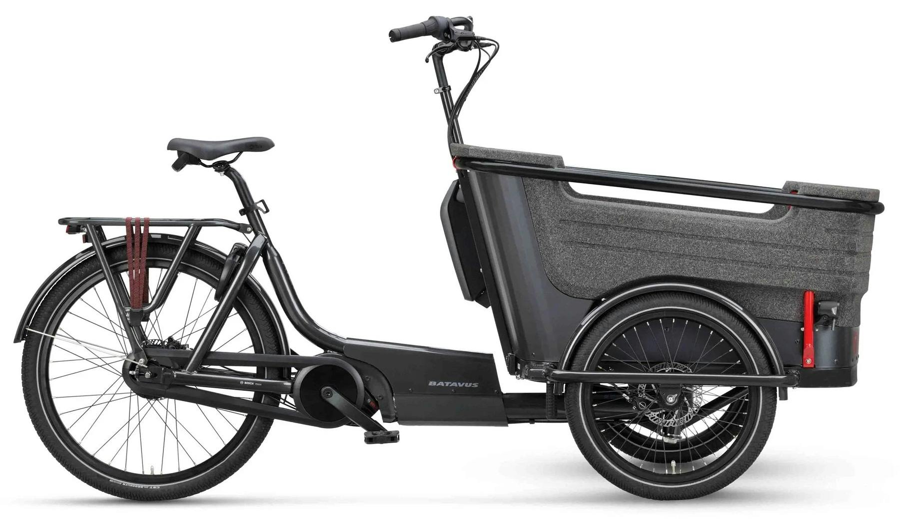 De Batavus Fier 3 bakfiets (78 kg) is voorzien van een extra grote en hoge bak. Ideaal om nóg meer te kunnen vervoeren. Zo heeft de bak zelfs een laadvermogen van maar liefst 100 kg. Er is plek voor maar liefst vier kinderen, maar je kunt ook een Maxi Cosi of babyschaal monteren. Met de krachtige Bosch Cargo Line middenmotor (85 Nm) zijn een stevige tegenwind en steile brughelling geen enkel probleem. Op accugebied is er een keuze uit een exemplaar met 300, 400 of 500 Wh. Standaard is de Fier 3 uitgerust met een traploze Enviolo-versnelling, maar de bakfiets is ook verkrijgbaar met een Shimano Nexus 5-versnellingsnaaf. Voor achterliggers ben je extra goed zichtbaar dankzij Batavus V-light. Met deze verlichting wordt er met laserstralen een V-vorm rondom de achterzijde van de bakfiets geprojecteerd. Hierdoor creëer je een eigen veiligheidszone.