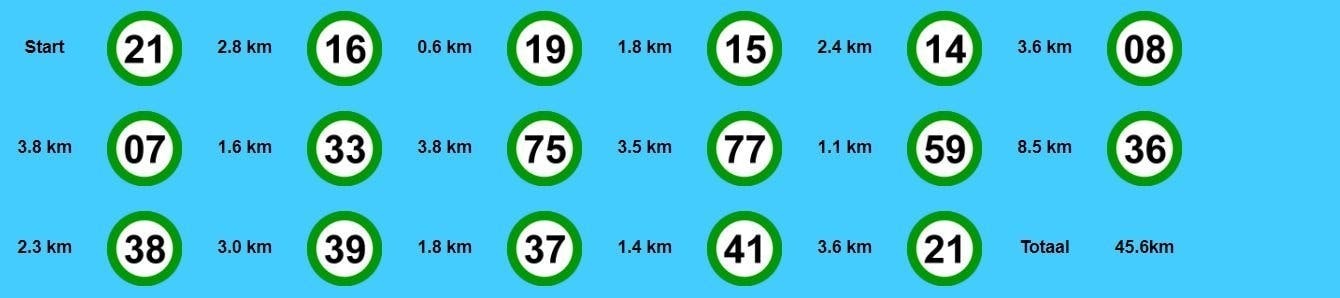 De route start bij knooppunt 21 in Emmen. In en rondom Emmen zijn al meerdere hunebedden te vinden. Om knooppunt 21 heen liggen de hunebedden D41, D43 en D45. Hunebed D41 ligt aan de rand van de wijk Emmermeer. Hunebed D43 is speciaal: dit is namelijk het enige langgraf type dat in Nederland te vinden is. In Duitsland en Denemarken vind je meer van dit soort graven, maar Nederland telt er maar één. Hunebed D45 ligt in de Emmerdennen en is het op een na grootste hunebed van Nederland.