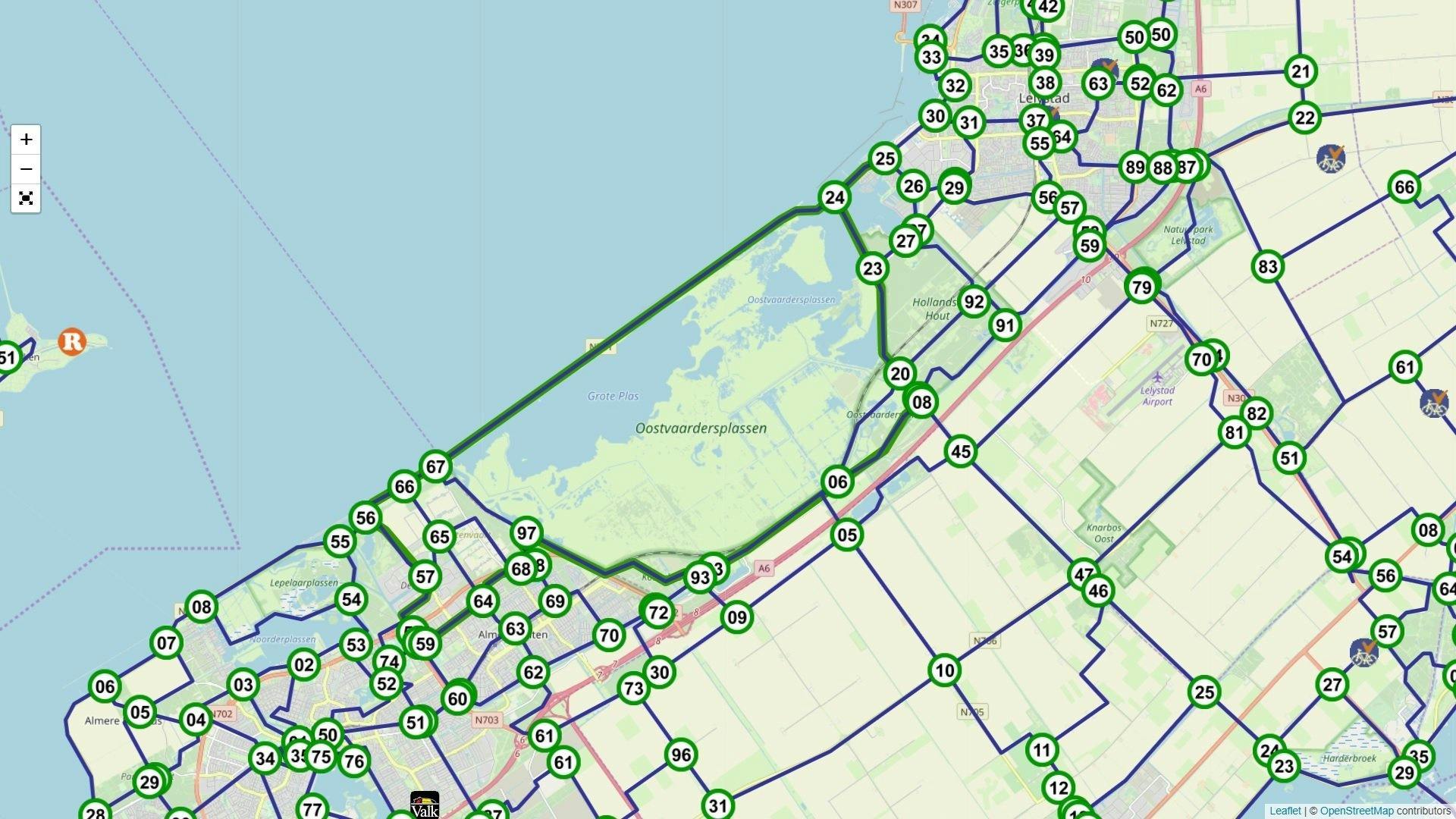 Deze fietsroute door Flevoland begint in de haven van Lelystad en voert je langs en door de Oostvaardersplassen. In een rondje van 43 kilometer fiets je onder andere over de Oostvaardersdijk tussen de Grote Plas en het Markermeer door en kun je genieten van een weids en ruim vergezicht.