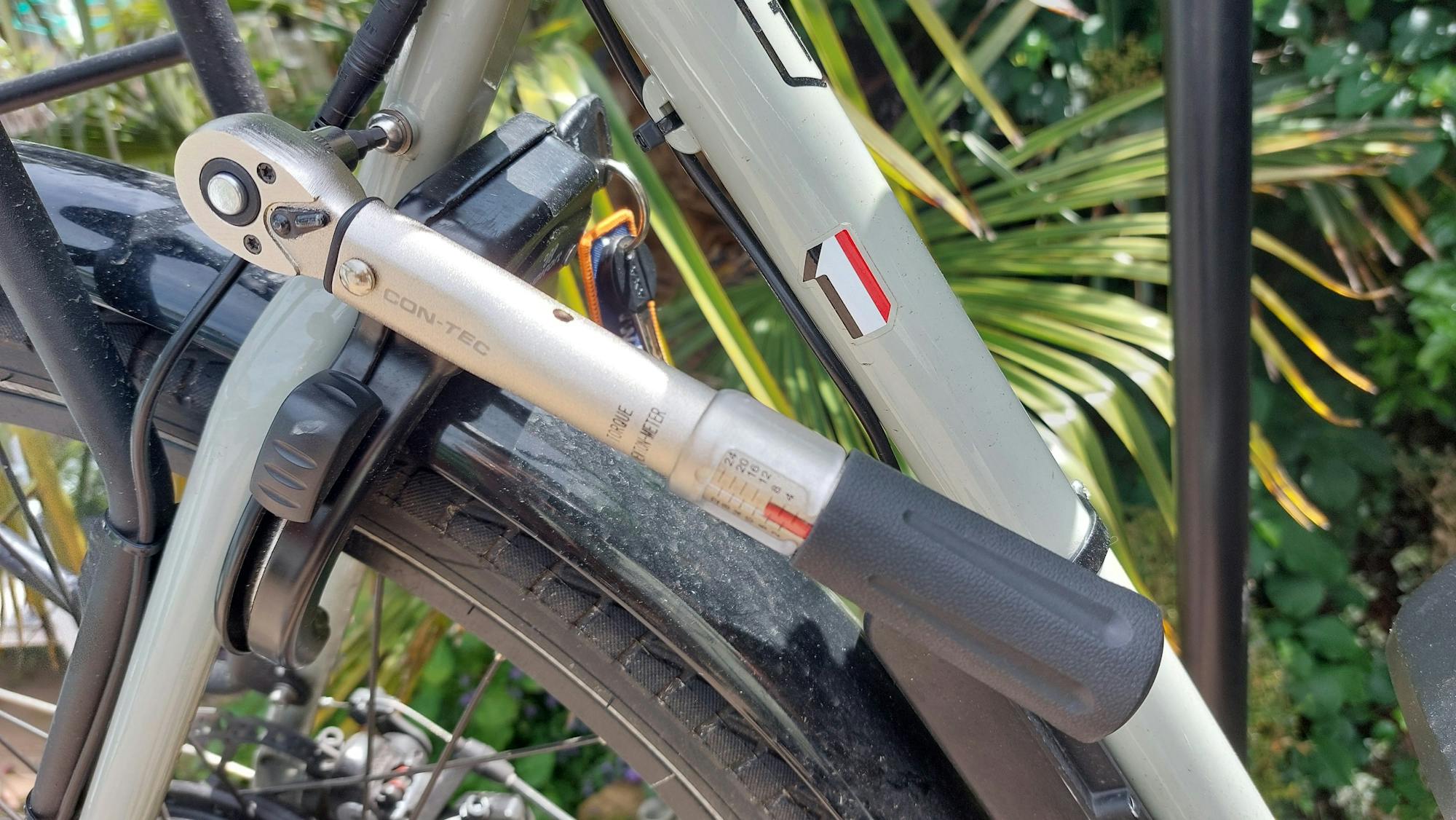 - Controleer regelmatig of alle boutjes en schroeven nog goed vastzitten. Handig hierbij is een kleine momentsleutel, zodat je alles met het juiste aandraaimoment kunt vastzetten. In de handleiding van de e-bike, maar vaak ook op het onderdeel zelf staat het aandraaimoment aangegeven.