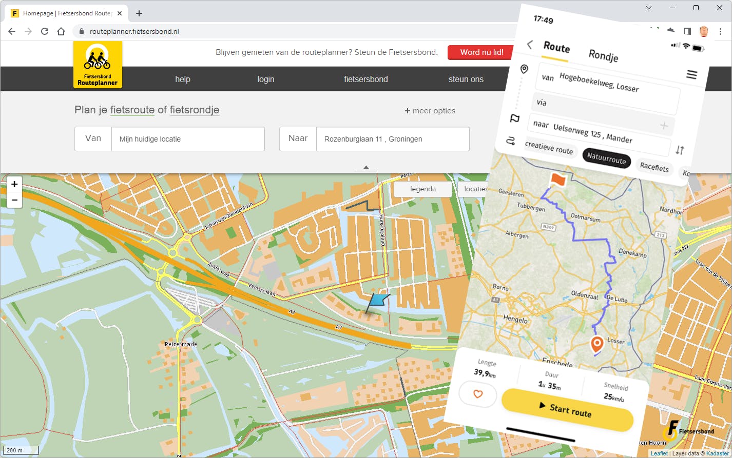 De Fietsrouteplanner van de Fietsersbond is beschikbaar online als website en ook als app voor de smartphone. Of je dus liefst vooraf thuis een route bedenkt of pas onderweg, het kan allemaal. En daarbij beschikt deze Fietsrouteplanner over meer en meer gedetailleerde kennis van Nederland en de vele fietspaden dan alle andere routeplanners. Bovendien wordt al die voor het bepalen van een route belangrijke informatie, elke dag gecontroleerd en geüpdatet door een groot aantal vrijwilligers. Als het gaat om de laatste veranderingen in een route, een tijdelijke omlegging of diepe kuilen na een natte periode, dan is deze routeplanner als eerste en als beste geïnformeerd.