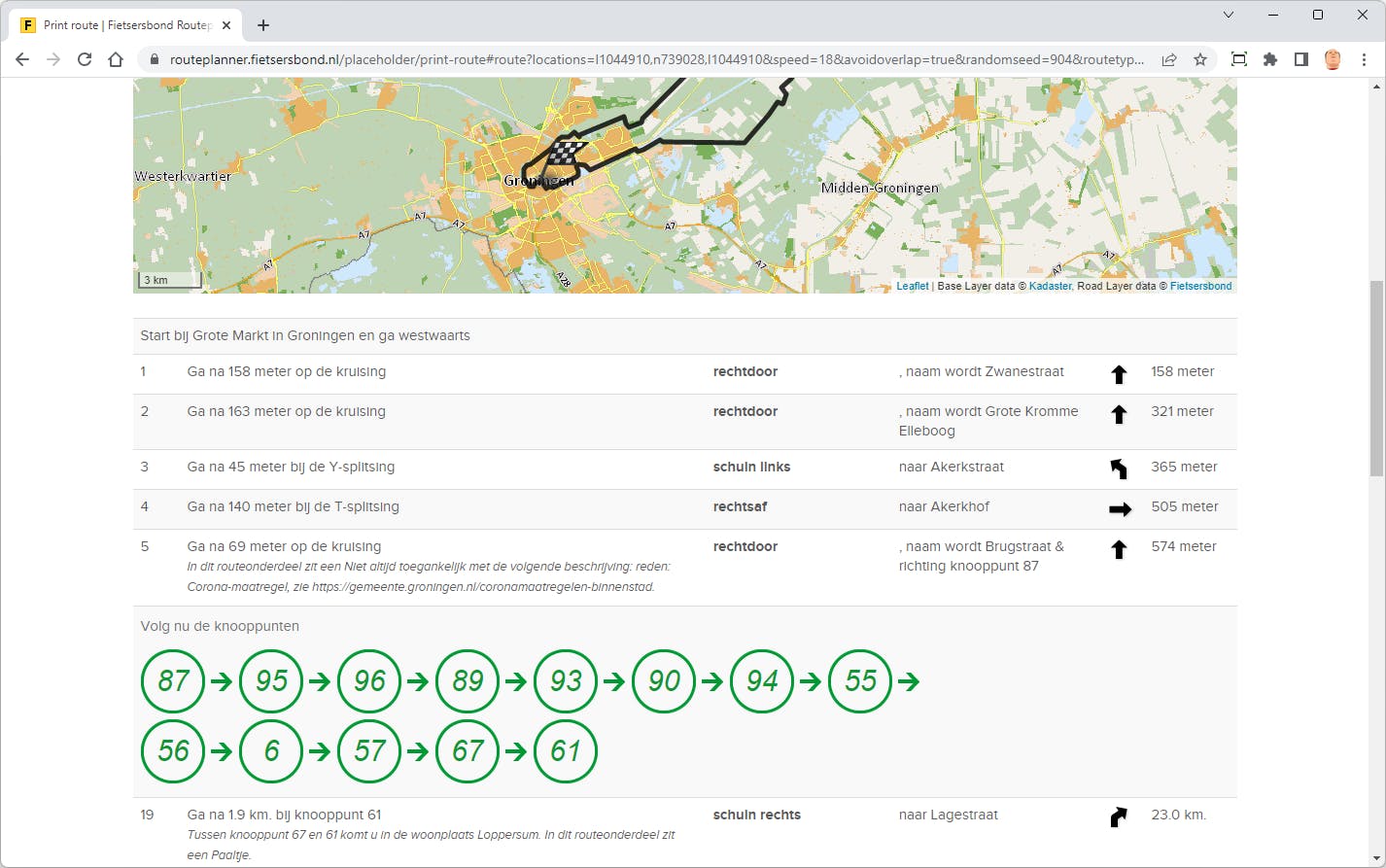Iets dichter bij huis blijven de knooppuntenroutes. Anders dan met een LF-route waarbij je een vaste route fietst, bepaal je bij een knooppuntenroute zelf de route en fietst die van knooppunt naar knooppunt. De knooppunten koppelen voornamelijk de mooiere en iets meer autoluwe routes aan elkaar. Om een knooppuntenroute te maken kies je bij het routetype Via knooppunten. In de app volgt de navigatie direct de knooppunten. Gebruik je de site dan is het handig de knooppunten uit te printen. Kies Print met als extra optie Knooppuntnummers in de tekst of alleen knooppuntnummers, tenzij niet aanwezig