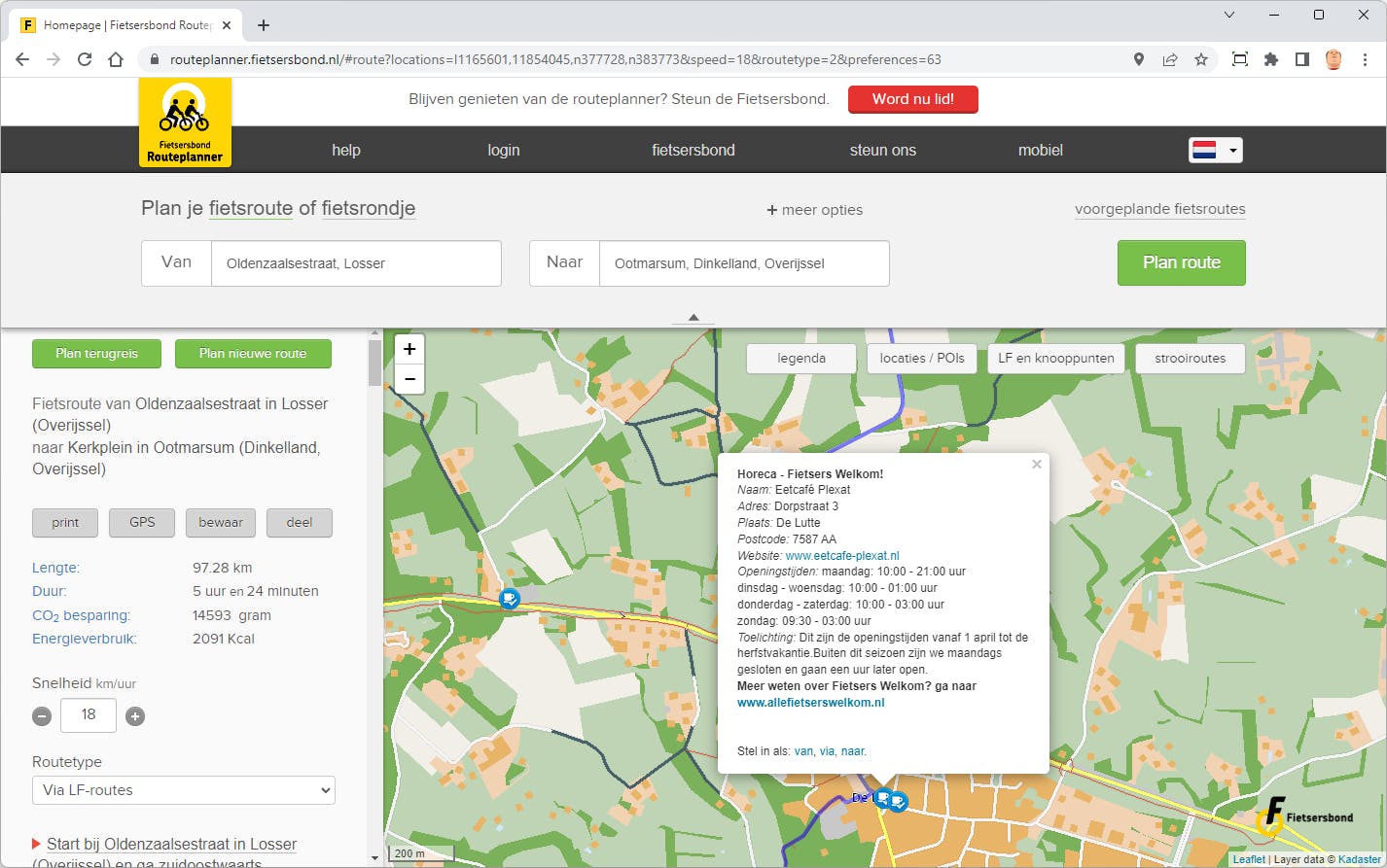 Geen fietstocht zonder koffie (thee mag ook) met appeltaart. Ook hierin voorziet de routeplanner van de Fietsersbond. Via de optie Locaties / POIs kun je in de webversie al direct allerhande nuttige ‘points of interest’ laten aangeven die op of nabij de route liggen. Een belangrijke categorie bij de POI’s betreft natuurlijk de Overnachting-horeca waaronder die van de café en eetgelegenheden. In de app schakel je deze in via het hamburgermenu rechtsboven (de drie horizontale streepjes) en dan Instellingen / Nuttige plaatsen. Door op een POI of locatie te klikken krijg je nuttige informatie zoals adres, telefoonnummer maar ook openingstijden, de website en nog veel meer. Geen fietstocht hoeft zo nog zonder appeltaart of goede kaasplank te blijven!