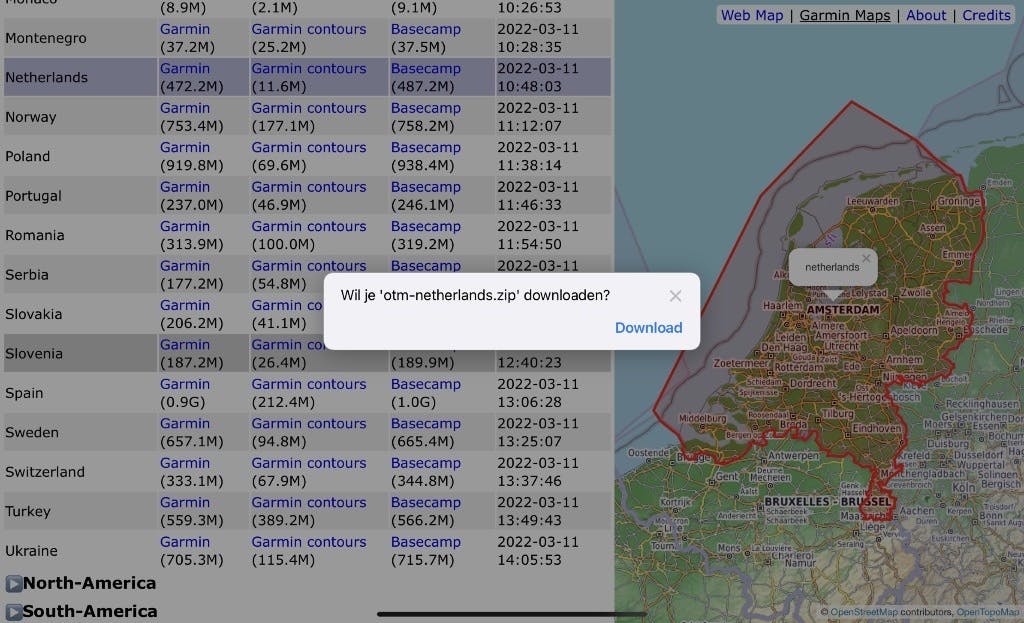 Op de site van OpenTopoMap Garmin Maps scroll je een stukje naar beneden en klik je links op Europe. Klik op de Garmin-kaart van het land naar keuze, waarna het downloaden na een klik op Download begint. Kan even duren, want het gaat soms om bestanden van meerdere Gigabytes (vandaar dus dat die SD-kaart wel van pas komt).