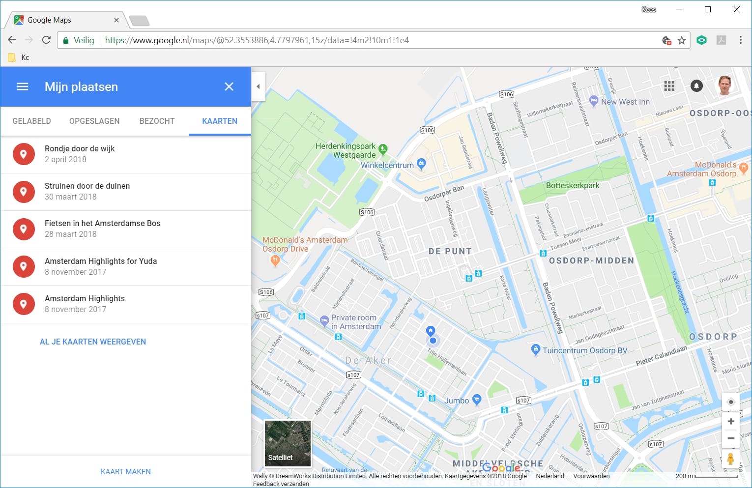 Zin in een heerlijke wandeling of fietstocht? Je maakt tegenwoordig eenvoudig je eigen wandel- of fietsroute aan in Google Maps op je computer. Om dit te doen, meld je je met je Google-account aan op de website https://maps.google.nl. Klik rechtsboven in het browserscherm op Inloggen en voer jouw gebruikersgegevens in. Of selecteer hier een Google-account als je al eerder aangemeld bent geweest. Vervolgens klik je links bovenin op het menupictogram. Dat zijn drie liggende streepjes boven elkaar. Kies de optie Mijn plaatsen en ga naar het tabblad Kaarten. Op dit tabblad zie je straks alle kaarten die je aanmaakt, oftewel jouw eigen wandel- en fietsroutes. Om de eerste route aan te maken, klik je onder in het tabblad op Kaart maken.