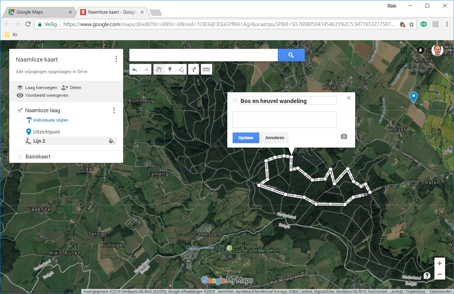 Ga je naar een gebied waar je vrij door het terrein mag dwalen of met paadjes die niet op de kaart staan? Dan heeft het geen zin Google Maps netjes de paden te laten volgen, als die er al zijn. Kies in dat geval onder het zoekvak voor Een lijn tekenen en kies Lijn of vorm toevoegen. Klik je nu op de kaart om punten aan te geven, dan worden er alleen rechte lijnen tussen getrokken. Of er een weg is of niet, daar trekt Google Maps zich niets van aan. Klik één keer voor het beginpunt en voor elk tussenpunt, dubbelklik weer op het laatste punt. Als er geen wegen zijn, toont de standaardkaart meestal te weinig herkenningspunten. Activeer in het kader links dan tijdelijk Satelliet in plaats van Basiskaart. Dan zie je een stuk beter hoe je wilt lopen of fietsen.