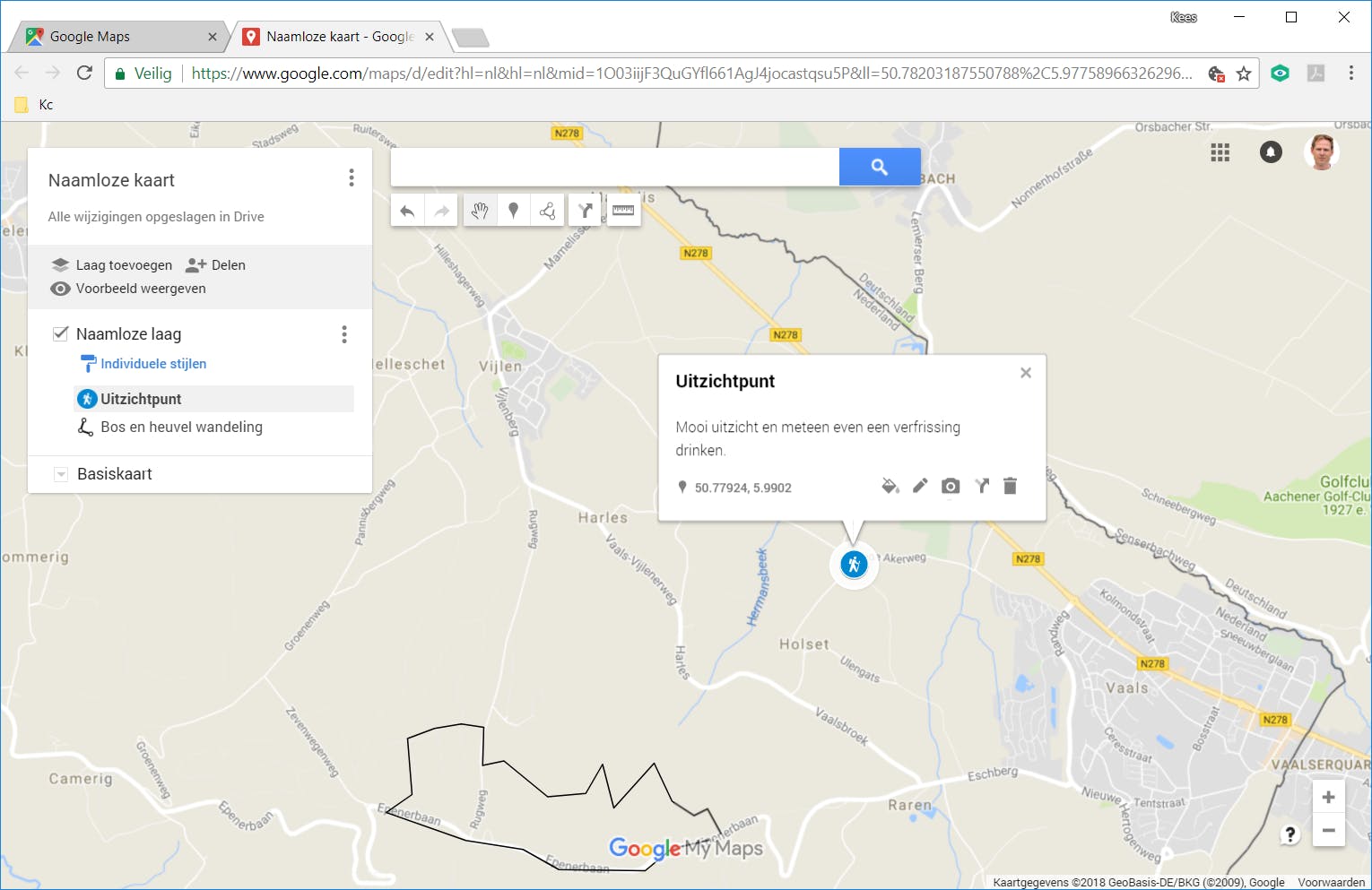 Wat je in Google Maps maakt zijn kaartlagen waarmee je extra informatie toevoegt. Die lagen worden vervolgens boven op de standaardkaart getoond. In het kader links op het scherm zie je alle lagen die je hebt aangemaakt. Bijvoorbeeld de markeringen voor interessante punten die je onderweg tegenkomt, maar ook de route die je uitstippelt. Lagen kun je een andere naam geven door erop te klikken, zodat je ook later nog weet wat je ermee bedoelt. Van markeringen kun je niet alleen de naam veranderen, je mag ze ook een handige kleur geven en van een toepasselijk pictogram voorzien. Zo zie je meteen of het bijvoorbeeld een restaurant, overnachtingsadres of fotohotspot is.