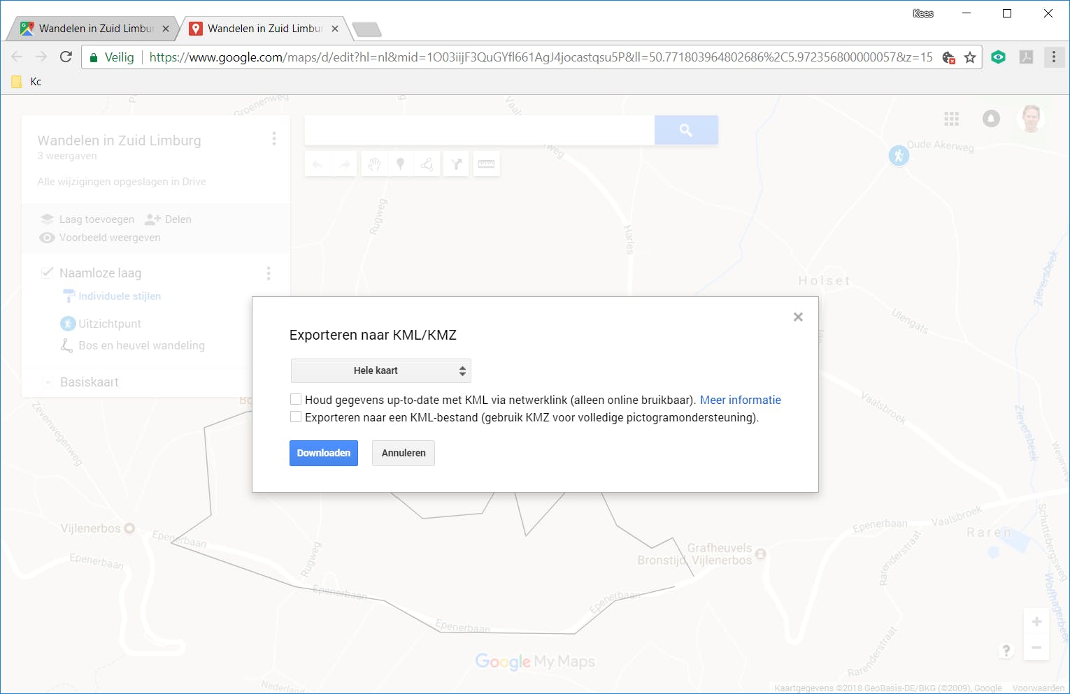 Een zelfgemaakte route kun je bewaren als een KMZ-bestand, zodat je hem ook in andere programma’s of apps kunt gebruiken. Om dit te doen ga je eerst even terug naar Google Maps in de browser. Ga via Mijn plaatsen in het menu naar het tabblad Kaarten. Klik op een route en kies Openen in My Maps. Je bent nu terug bij het scherm waar je daarnet jouw route in elkaar hebt gezet. Je kunt de route hier onder andere aanpassen of uitbreiden, maar dus ook exporteren. Klik in het kader achter de naam van jouw kaart op de drie puntjes, kies Exporteren naar KML/KMZ en klik op de knop Downloaden. Als je het bestand bij een clouddienst zoals Dropbox bewaart, kun je de route makkelijk oppakken op je telefoon. Je kunt hem natuurlijk ook lokaal op je computer opslaan en daarna via bijvoorbeeld e-mail naar jezelf sturen.
