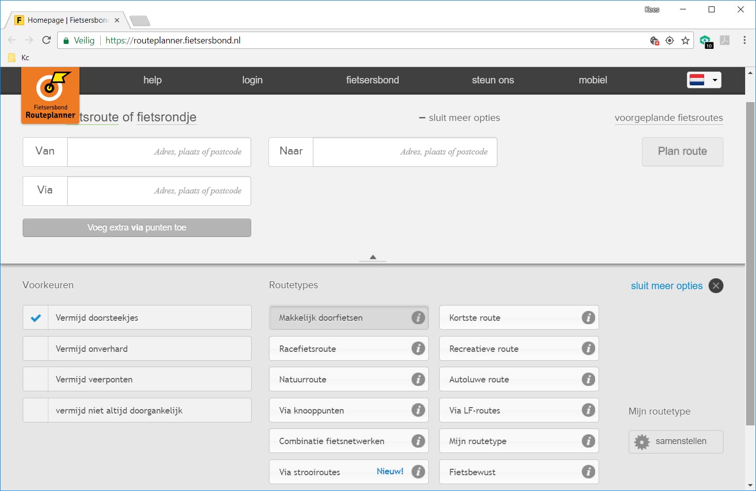 Als fietser heb je vast een voorkeur voor mooie routes waarbij je lekker kunt doortrappen, vooral als je lange afstanden aflegt. In dat geval is het handig de routeplanner van de Fietsersbond te gebruiken. Je kunt dan eventueel gebruik maken van de zogenaamde fietsknooppunten: een bewegwijzerd netwerk van knooppunten in Nederland, speciaal bedoeld voor fietsers. In de meest eenvoudige vorm geef je op de website alleen het beginpunt en het eindpunt op en laat je met een klik op Plan route je route automatisch plannen. Klik je op meer opties, dan kun je aangeven welk type route jouw voorkeur heeft, zoals Makkelijk doorfietsen, Racefietsroute of Natuurroute. Dat geeft je veel meer grip op het bepalen van de route. Ook kun je via de voorkeuren aangeven of je zaken als onverharde wegen en veerpontjes wilt vermijden.