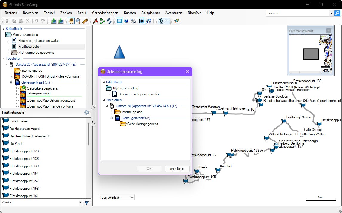 Voor Garmin-gebruikers is Garmin Basecamp een nuttige tool om data zoals kaarten, waypoints en routes te beheren, en over te zetten van pc naar gps. Verbind je gps met je pc. Als het goed is, herkent Basecamp het apparaat automatisch en kun je via Bestand / Importeren naar ‘Mijn verzameling’ ook gpx-bestanden importeren. Daarna kun je met de rechtermuisknop op Bibliotheek / Mijn verzameling of een item daarin klikken, Verzenden naar kiezen en (Interne opslag van) je gps-apparaat selecteren voor de transfer.