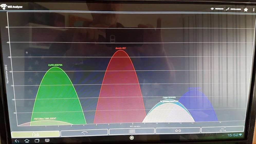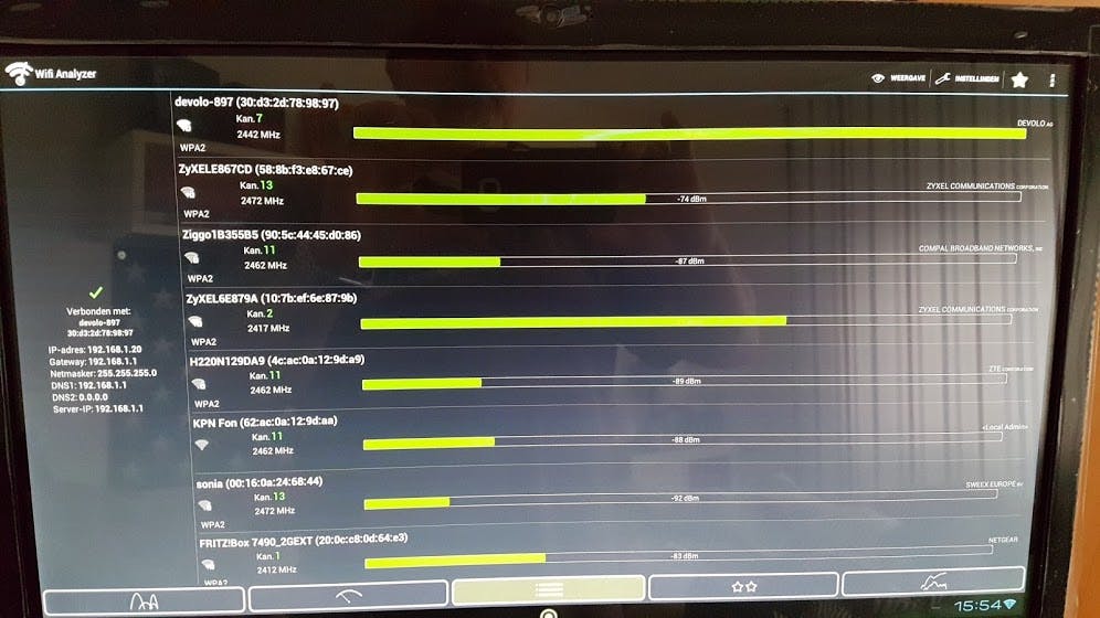 Er komt een Laptop bij op de 5 GHz band. Er moet nog wat thuis gewerkt worden, dit gaat via de zwaar beveiligde server van het werk. Dit doen we altijd met een draadje anders komen we er niet in. Via de Devolo gaat het nu op wifi goed.