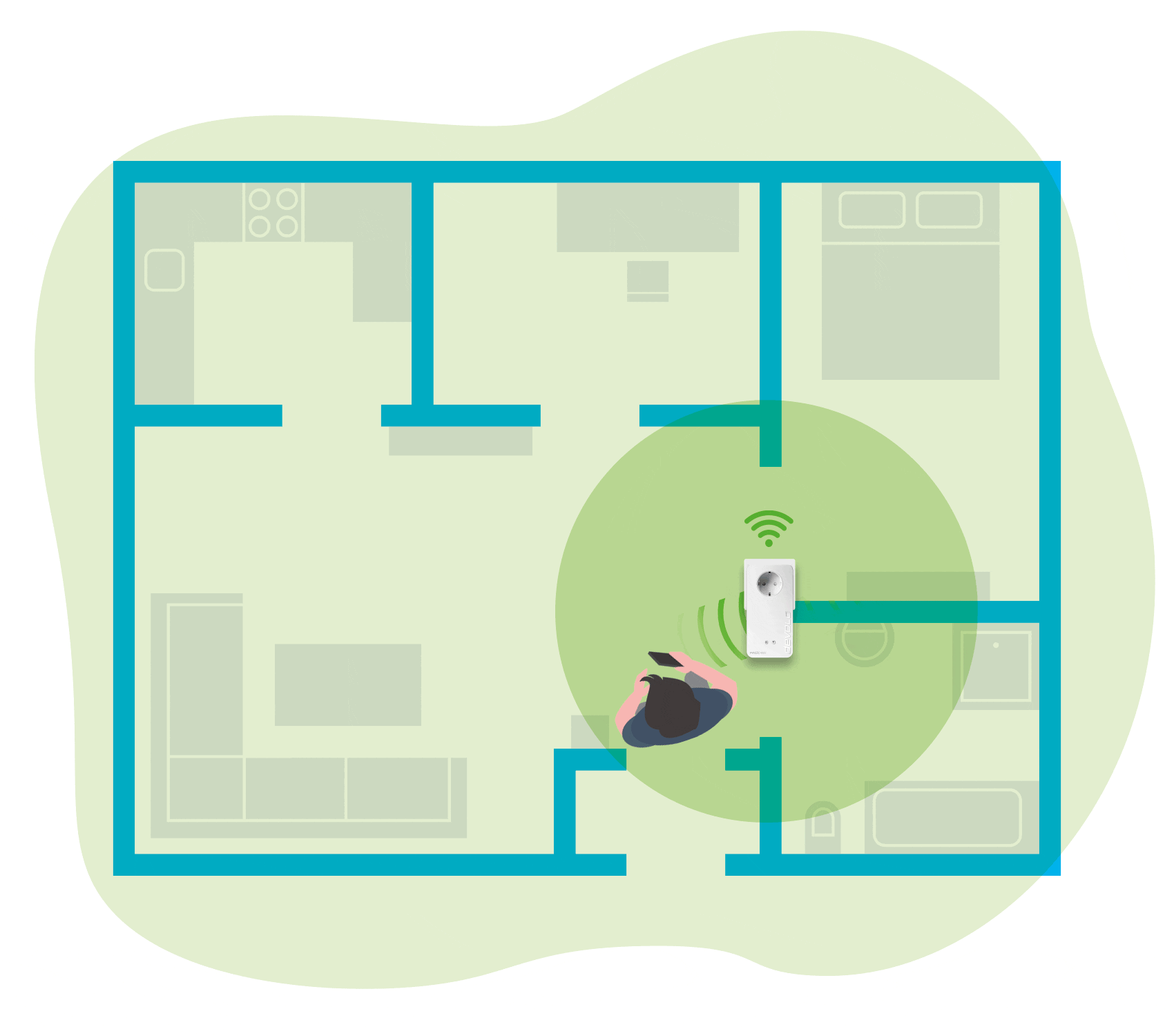 In combinatie met beamforming-technologie realiseert de repeater moeiteloos een krachtige verbinding met ieder draadloos apparaat. Bij gebruik van meerdere devolo-producten met wifi-ondersteuning ontstaat er zelfs een heus mesh-netwerk, waarbij de toegangspunten het draadloze signaal onderling uitwisselen. Smartphones, tablets en overige draagbare apparaten zijn dan voortdurend verbonden met het krachtigste toegangspunt.