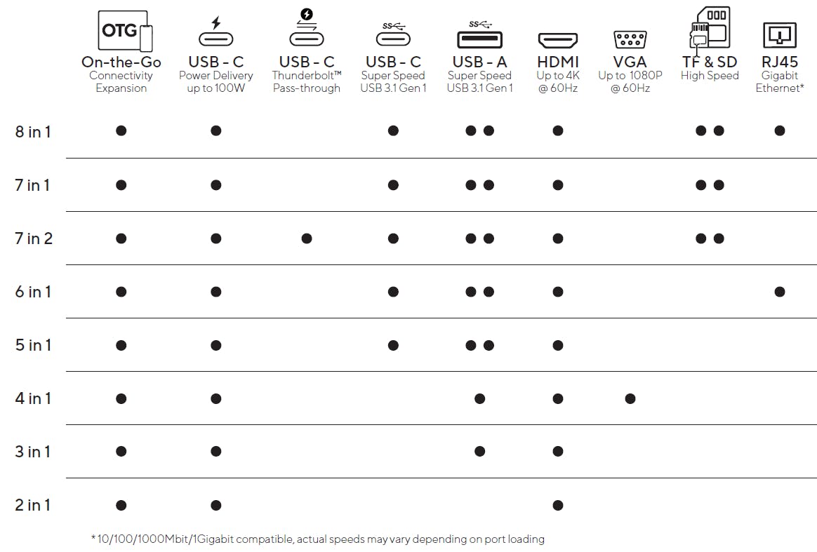 De LINQ 5-in-1, 6-in-1, 7-in-1 en 8-in-1 geven je nog meer aansluitingen. Enkele daarvan hebben ze gemeen. Ze kunnen bijvoorbeeld allemaal je laptop opladen, en geven je één extra usb-c aansluiting en twee usb-a-aansluitingen. Tevens beschikken ze over een hdmi-aansluiting. De 6-in-1 en 8-in-1 geven je aanvullend een rj45-netwerkaansluiting en op alleen de 7-in-1 en 8-in-1 vind je een kaartlezer voor microsd en sd.